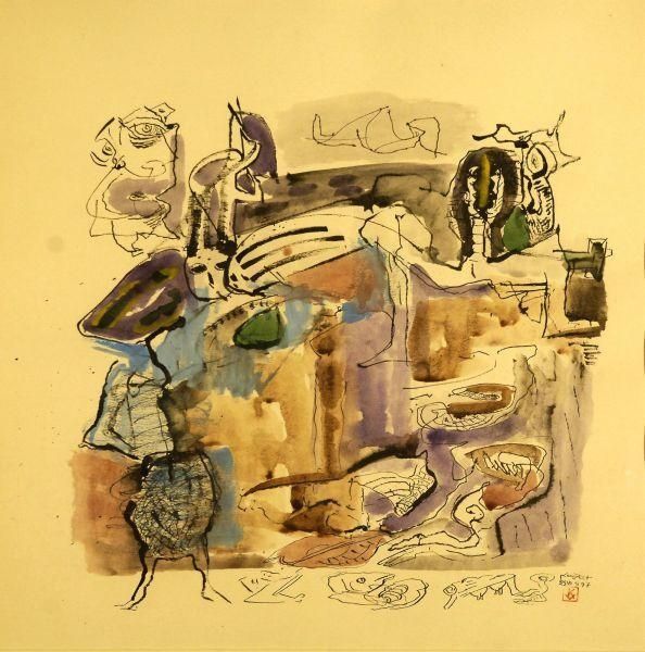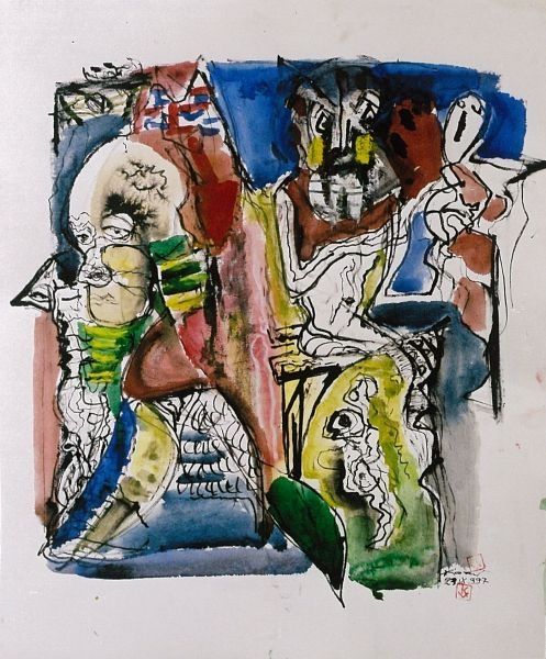 Curator: This untitled mixed-media work by Vasile Kazar presents a captivating blend of figuration and abstraction. The piece combines ink, pastel, and drawing techniques to create a dense, intriguing composition. Editor: My immediate reaction is that this feels chaotic, almost like a dreamscape where familiar forms are distorted and jumbled. The lack of a clear focal point adds to that unsettling feeling, wouldn’t you say? Curator: Precisely. I think the distortion speaks volumes about the period of creation, given it likely comes from the late 20th century based on Kazar’s profile. Consider the socio-political turbulence—the cold war, various liberation movements—and how those anxieties and disruptions of power structures found their way into art, unsettling traditional modes of representation. Editor: You’re right, there is a nervous energy to it, amplified by the mixed media. I am interested in the artist's choice to leave the work untitled, almost as if they intentionally aimed to leave room for broad social interpretations. The blend of mediums gives an unfinished feeling. Curator: I find it intriguing how figuration is used, not to depict reality, but perhaps to hint at repressed narratives, those hidden within the lines and the intentional "blurriness.” Editor: Right. The figures almost seem to be fighting to break through the abstract elements. What would you say is the role of those stark contrasts of dark ink against the lighter pastels? Curator: That contrast underscores a dialogue, or perhaps a conflict. It visually represents how personal experiences and the artist’s cultural moment engage—or clash—with broader societal norms. The strong outlines make me think about political caricatures, as in Grosz, especially because these are ink drawings with figurative motives. Editor: That tension is certainly palpable. And I am keen on seeing the institution that will show this type of social statement, with this blending of mediums and political charge. The effect of a mixed media adds layers of meaning here. It's raw. Curator: Indeed, this piece by Kazar urges us to question the role art plays in reflecting and shaping the world around us. It provides an outlet for socio-historical understanding. Editor: For me, reflecting on this piece reinforces the significance of providing exhibition space for those who have the least agency to create it.