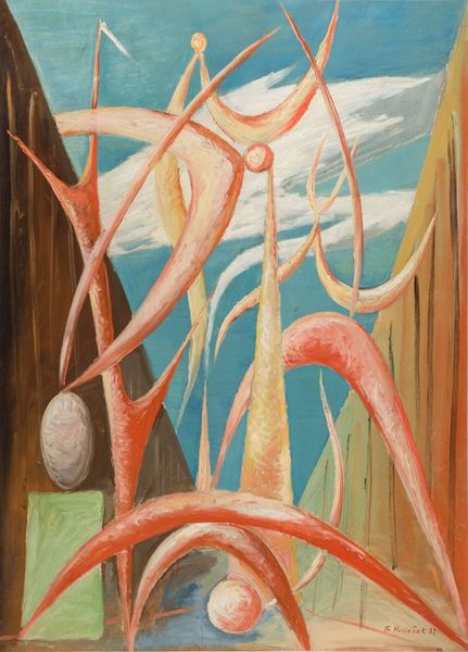 Editor: Right now we're looking at "HEART DANCE" by Chaim Goldberg. It seems to be acrylic on canvas, although its date and location are unknown. At first glance, I see incredible, vibrant movement. There are two entwined forms of orange and yellow, which certainly evoke heart shapes. What captures your attention most about this piece? Curator: Ah, "HEART DANCE"! What enchants me are the stories whispered between those interwoven forms, like souls in an eternal tango. Notice how Goldberg uses blues and greens in the background – it is as though he has carved out the heart dance forms from some ancient mythical forest. I can feel my breath get caught somewhere between longing and joy, almost as if recalling a childhood game, do you feel the painting telling any stories to you? Editor: Definitely joy! There is a lightness here. Maybe Goldberg captured a love that’s both playful and deep. But how does the “tattoo art” AI tag come into play here? It’s an interesting connection. Curator: Indeed, it's a striking point. Tattoo art implies permanency, ritual, and storytelling upon skin, but it is created here by fleeting watercolors upon porous canvas. Perhaps it’s the vulnerability of love, where emotions can leave permanent marks on soft, living hearts. It's a potent contrast, no? What a magnificent question this painting poses, don't you think? Editor: Absolutely! It reframes how I see it now—as not just an expression of love, but also its delicate nature and lasting effects. Thank you for sharing your vision of Goldberg’s “HEART DANCE” Curator: My absolute pleasure! These swirls might not be so swirly, and maybe my heart has taken wing!
