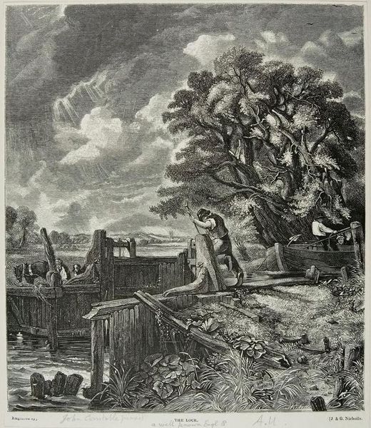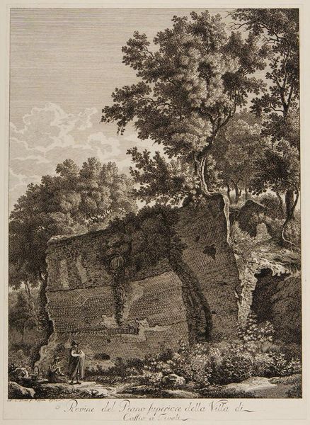 Editor: This print, "Profiles in large Ionic order forming the upper part of the tomb" by Giovanni Battista Piranesi, is striking. It feels monumental and somber. How do you interpret the architectural forms and the landscape? Curator: Observe how Piranesi manipulates the contrast between light and shadow to define the forms. The stark darkness of the foreground structures gives way to the radiant light bursting through the gate, creating a sense of depth. What do you make of the scale? Editor: The figures in the foreground seem so small compared to the architecture. It almost feels like Piranesi is emphasizing the insignificance of man against the backdrop of historical grandeur. Curator: Precisely. It is not just about historical grandeur. Note how the hatching and cross-hatching contribute to the textural richness of the print. The density of these lines models forms, articulating material differences, and generating tonal gradations, guiding the viewer's eye through the architectural planes and into the landscape. What affective result does this evoke? Editor: A sense of drama and decay. The detail in the stonework also makes me think about permanence. It’s very powerful! Curator: Yes, the composition creates a dynamic tension. It beckons toward light, and implies infinite pictorial depth beyond the gates. The manipulation of linear perspective adds to this. How do you view his landscape elements? Editor: Now that you mention it, the foliage looks quite stylized. But the overall effect is captivating. The strict geometry of architectural elements contrasts with the organic qualities of the landscape. I now view this print as a visual language speaking across the divide between art and architecture. Thank you! Curator: An excellent observation! Thank you.