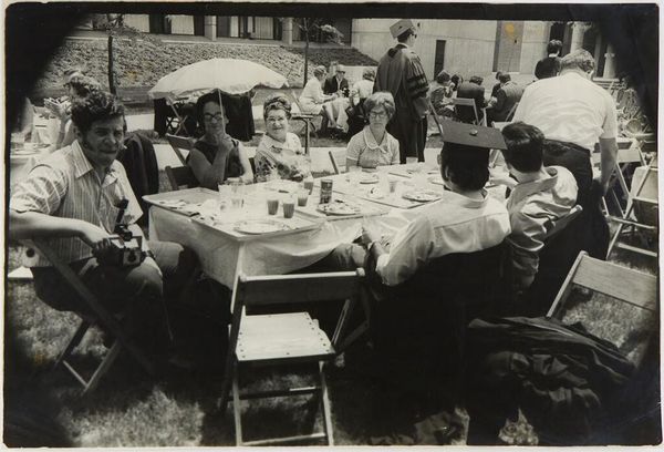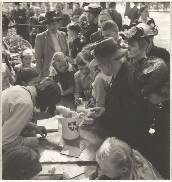 Editor: So, this is Robert Frank's "Festival--Children," a gelatin-silver print from around 1941. The sheer number of cups lined up on that table really strikes me. What social commentary do you think Frank was making with this photo? Curator: It's a deceptively simple image, isn't it? While on the surface, it depicts a children's festival, look closely at the symbols and the expressions. The prominence of the Swiss flag, for example, wasn't merely patriotic. This was taken during the war; what do you suppose the flag represented during such times? Editor: Probably neutrality? Or maybe an idealized sense of national identity, something stable to cling to. Curator: Precisely. Consider, also, the act of distribution—someone is dispensing something to the children. Is it generosity or a subtle form of control? The era also shapes our interpretation, right? Photography like this takes on new meanings considering it comes from someone like Frank who would later engage in so much counter-cultural commentary on American society. It’s the contrast that really makes this early work interesting. Editor: That makes sense. I didn’t think about it as possibly questioning power dynamics, even in what seems like a purely innocent scene. I suppose Frank’s later work kind of taints this piece too? Curator: His later work provides a crucial context. We know Frank’s skeptical gaze. It encourages us to ask, even here, about what is presented versus what is truly happening. Editor: Wow, I’ll never look at a simple photograph the same way again. Seeing it in this light has definitely given me a richer perspective. Curator: It highlights how art can be both a reflection of and a commentary on the social and political environment in which it was created.