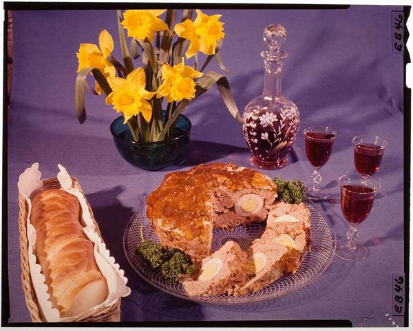 Editor: This photograph, titled "Untitled (meatloaf, bread, wine, and flowers on table)" by Jack Gould, presents a peculiar still life. I’m struck by how the arrangement of these disparate elements feels almost staged, with the contrasting textures creating an odd harmony. What do you see in this piece? Curator: The formal arrangement is indeed intriguing. Note the contrasting textures, as you pointed out. The smooth glass of the wine decanter and glasses plays against the rougher texture of the bread and meatloaf, while the vibrant yellow of the daffodils offers a stark contrast to the muted tones of the food. Do you perceive a certain tension created by the asymmetrical placement of the objects? Editor: I see what you mean. The bread basket on the left is balanced by the flowers and wine on the right, creating a sort of visual counterweight. It does feel very deliberately arranged. Curator: Precisely. Gould seems to be playing with the interplay of light and shadow and the contrasting textures to create a dynamic composition that transcends the mundane subject matter. I find the structural juxtaposition of organic and inorganic shapes interesting as well. Editor: It's amazing how much can be gleaned from a seemingly simple still life. I'll definitely look at photographs differently now. Curator: Indeed. Formal analysis allows us to decode layers of meaning often overlooked at first glance.