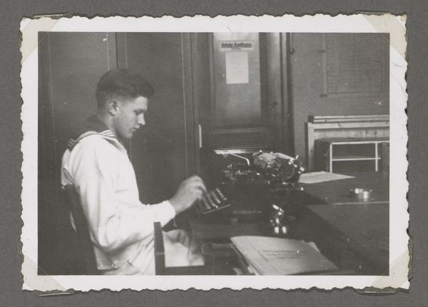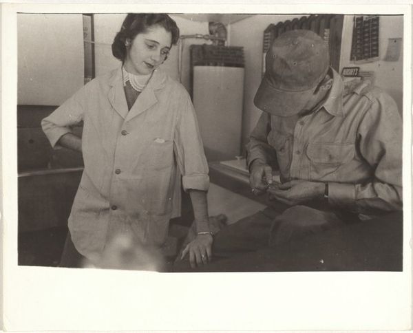 Editor: Here we have Robert Frank's "Coffee shop counter--Houston, Texas" from 1955, a gelatin silver print. There’s a quiet, almost melancholic feeling about it. I'm drawn to the stark contrast between the youthful couple and the server in the background. What do you see in this piece, something beyond the surface, perhaps? Curator: Ah, yes. This photograph, to me, whispers stories of America in the mid-20th century. Look at the way Frank frames the scene. The young couple, seemingly lost in their own world, juxtaposed against the African American server, creating a visual divide that reflects the social realities of the time. What do you make of their gazes? Editor: The couple seems so disengaged, almost somber. And the server has this weariness... Are you suggesting Frank is commenting on racial segregation and class differences? Curator: Precisely. Frank wasn’t just capturing a moment; he was revealing underlying tensions. It's in the details: the pristine counter versus the unseen kitchen, the innocence of youth versus the burdens of labor. The contrast in the blacks and whites, very deliberate I suspect. Think of it as a poem, each element a carefully chosen word. Does that resonate? Editor: Definitely! It’s like the photograph is holding up a mirror to society, reflecting both its beauty and its ugliness. I initially saw it as just a snapshot, but now I appreciate its complexity. Curator: Isn’t it marvelous how a single image can contain so much? It’s like a pebble thrown into a pond; the ripples of meaning keep expanding. It shows how crucial perspective and experience shape our interaction with works like these. Editor: I’ll certainly view street photography differently from now on. Thanks for helping me unlock a deeper understanding!