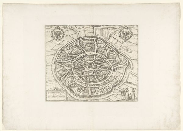 Curator: Let's examine this piece titled "Plattegrond Middelburg," dating circa 1657-1728, housed here at the Rijksmuseum. It's an engraving in ink on paper. Editor: It’s fascinating! It's such a detailed rendering, almost like an aerial photograph before planes were even invented. The intricate line work makes the whole composition so precise, even though it represents an entire town. What catches your eye when you examine this work? Curator: Note the interplay between order and chaos. The town's circular form and fortified walls offer a strong, defined structure. However, within this structure lies a complex web of streets and buildings. This tension is echoed in the varying line weights. What do you make of the areas where lines are clustered, creating darker masses, compared to areas of more open space? Editor: It seems the density of lines really emphasizes the important or populated parts of the town center, as well as the defensive structures. It's a clear visual hierarchy created purely through line and space. How do the different textures add to that effect? Curator: Precisely. The varying textures, achieved through hatching and stippling, delineate different areas - the built environment, the surrounding fields and waters. This is the picture plane organized into distinct units which create both contrast and harmony. Consider how the graphic elements combine to present the information of the town. It also prompts thoughts on cartography as a way to wield visual power. Does viewing the artwork at this level provide a heightened understanding, do you think? Editor: Yes, absolutely! Focusing on the composition really highlights how even a seemingly informational piece like a map uses artistic principles to communicate effectively and perhaps subtly convey messages of control and order. Curator: Indeed. Understanding the artist's structural choices helps to unveil layers of meaning beyond the merely representational.