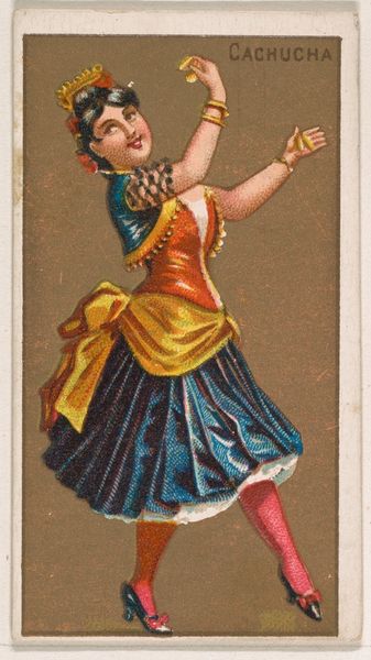 This small chromolithograph, "India," from the "Dancing Girls of the World" series, was issued by Wm. S. Kimball & Co. The dancer is presented in a dynamic pose, her body forming a series of curves and angles. The artist uses a contrasting palette of pinks, blacks, and golds to create a visually stimulating image against a muted background of brown, which serves to push the figure forward. The texture of the dancer's costume, with its frills and embellishments, adds a layer of complexity to the composition. The composition emphasizes the body as a site of cultural expression. Yet, it also perpetuates stereotypes and exoticizes the dancer for a Western audience. The work is less about authentic cultural representation and more about constructing an image that caters to certain cultural expectations and biases. The tension between aesthetic appeal and cultural representation invites reflection on the ways in which images can both celebrate and distort cultural identities.