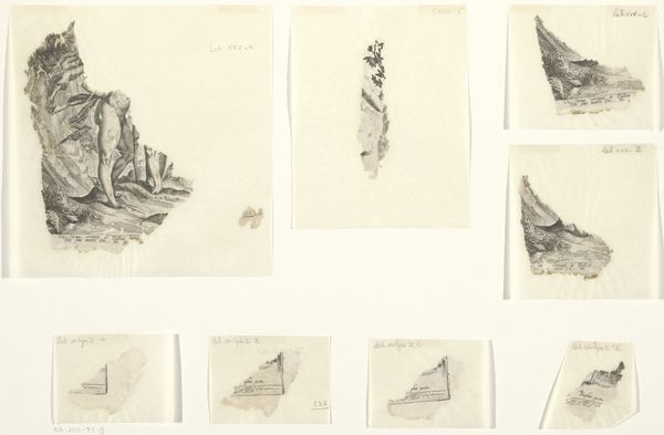 Curator: These fragmented prints from the late 16th century offer a really interesting puzzle. They’re titled "Losse fragmenten van een prent van het oordeel van Paris" by Zacharias Dolendo. Each small piece, etched and engraved, gives us only glimpses of the original scene. Editor: My first thought is “archaeology,” but on paper. They resemble delicate maps of lost territories, each tiny, a testament to some great, vanished… continent, or at least, composition. I find the fracturing itself, almost geological. What happened to it? Curator: It's really speculation, but one possibility is that they were damaged somehow – perhaps a fire, or just the ravages of time and clumsy storage – and someone, likely a collector or dealer, carefully mounted the remaining fragments to preserve them. They each are affixed to laid paper supports. Editor: I'm really intrigued by the process. The layers of decision-making involved – the original printmaker, Dolendo himself, carefully incising lines, then the catastrophic damage. Followed by the painstaking act of salvage and reconstruction. Each mounted fragment becomes an artwork about art-making, destruction, and preservation. Labor is really central to its story. What's Paris up to exactly, though? Curator: In mythology, Paris had to judge who was the fairest goddess among Hera, Athena, and Aphrodite, awarding the golden apple. In a way, this damaged artwork forces us to become Paris. We must look carefully, judging beauty even within these ruinous landscapes, using intuition, connecting seemingly random pieces, to conjure some narrative about the choice between power, wisdom, or love… the gift of Aphrodite to Paris being Helen of Troy and setting off that legendary war. Editor: Fascinating, thinking about this as active work for the viewer, the work is activated and renewed over time through this ongoing labor to restore. Even seeing the backs or sides of them, it does make me question ideas about beauty, as beauty, and questions how images circulate. Curator: Yes, a story echoed not just across time but across materials. Seeing these little shards I'm filled with possibility—what might have been, what still *could* be if one approached the material with hope and skill and time. Editor: These fragments are more provocative than any complete original could be. Like material whispers from a cultural ruin that never lets us rest.