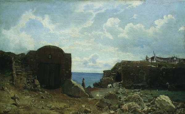 Curator: Today we’re observing "Ruins of the Rosemont castle", an oil painting by Johan Barthold Jongkind from 1861, a splendid example of plein-air romanticism. Editor: It evokes a sense of poignant stillness. The soft greys and browns lend a melancholic air. It makes you wonder about the castle’s story, its decline. Curator: Note the masterful application of paint. See how Jongkind contrasts the smooth sky with the textured surface of the ruined castle, built with expressive brushstrokes to give the architecture volume and detail. Editor: Absolutely. Ruins often symbolize the transience of earthly power and the relentless march of time, don't they? In this piece, I wonder what the small figures represent - are they simply going about their daily lives amidst historical decline? Curator: Precisely, and in the same breath Jongkind gives the viewer perspective on the present day through placement of the people. Also of significant consideration is how the ruined structures are positioned against a vast, open sky. The artist creates space and mass, a visual contrast with inherent symbolism. Editor: I’m struck by the symbolism inherent in the positioning of figures within the landscape. To me they signal endurance. And in the quiet details-- the peasant figures tending their cattle-- I find resilience. A sign that life goes on, regardless of fallen structures. Curator: A compelling observation. It demonstrates how structure creates meaning: Jongkind contrasts organic textures found in nature against geometrical stonework created by humans. Editor: Looking at this composition through an iconographic lens, the ruins can be seen as vessels of cultural memory. Each stone holds stories of past inhabitants, and also signals the inevitable decay of societal norms. Curator: I’d agree. Through analyzing how Jongkind used composition, materiality and surface application, one uncovers the historical narrative Jongkind has carefully presented to us. Editor: So even through the destruction, the symbols remain, providing new and future stories in time. Curator: A most perceptive ending note! Editor: Thank you, the painting told us everything we needed to know.