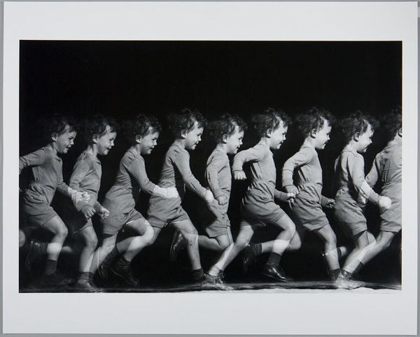 Editor: So, this is Harold Edgerton's "Moving Skip Rope," possibly created sometime between 1952 and 1981, using gelatin silver print photography. The figure repeating across the frame is fascinating and almost looks like a zoetrope in still form. What are your thoughts when you look at it? Curator: The visual fragmentation in Edgerton's photograph acts as a powerful metaphor. Here, we are not simply viewing an image of a woman skipping rope, but witnessing the deconstruction of time itself, isn’t it? Editor: I never thought of it that way! Curator: Consider how this photographic technique mirrors early feminist critiques of linear, patriarchal histories. Each frame presents a different moment, challenging the singular narrative often imposed on female bodies. It also recalls discourses in physics exploring space-time as a single continuum. It begs questions about agency, too. Editor: So you are saying that this image questions ideas around what the subject is actually doing and asks about who defines movement and freedom. It could be pushing us to look beyond the obvious representation of "a woman jumping". It becomes about visual storytelling! Curator: Exactly. Now, can you consider how its composition speaks to the evolving representation of women during the mid-20th century and consider how the layering can represent historical and ongoing issues related to race and inequality in terms of who gets to tell which stories, and how stories about specific groups and communities become popularized through image culture? Editor: The image has many overlapping and interconnected pieces; in the past, that may have just represented the visual movement of the person but is now making me consider societal concepts. I now appreciate that an artwork can make you question popular assumptions and narratives that have been shared historically. Thanks! Curator: Indeed. This makes it an exceptional piece for discussing social issues in the field of art and visual culture.