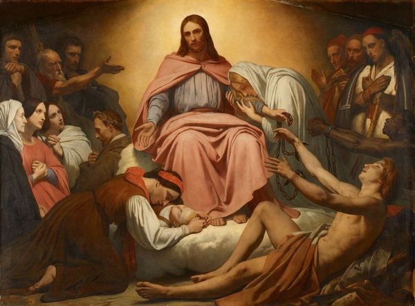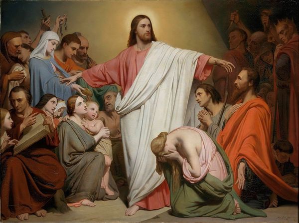 Carl Bloch created this oil on canvas painting, Christus Consolator, sometime in the 19th century. Immediately, one notices how the figure of Christ is bathed in light, sharply contrasting with the darker tones surrounding him. The composition is structured around this contrast, drawing the eye inexorably toward the central figure, an effect heightened by the arrangement of the surrounding figures, their gazes and gestures all oriented towards Christ. The painting operates on the semiotic level, employing conventional visual codes to convey its message. The colour white is associated with purity and divinity, the upturned hands a symbol of welcoming. These signs converge to create a narrative of solace, emphasized through the formal elements of light and composition. Ultimately, the painting's enduring power lies not only in its religious symbolism but also in how these symbols are structured. It evokes a sense of divine compassion and reflects a cultural desire for meaning and reassurance.