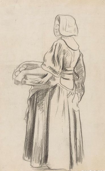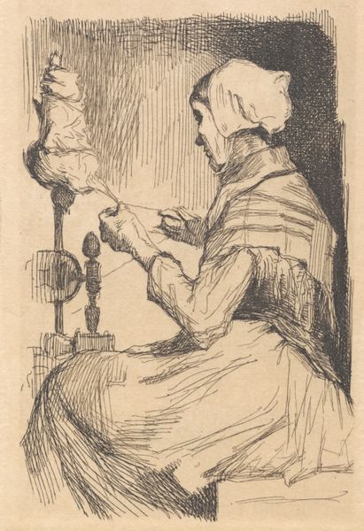 Curator: James McBey's etching, "A Volendam Girl," created in 1910, presents us with an intimate portrait of a young woman immersed in what seems a daily routine. Editor: The immediate impact is its quietness. It has this somber moodiness emphasized by the monochromatic palette and dense hatching used for her dress and apron. What exactly is she doing? Curator: Observe how McBey uses line to delineate form, especially the textures and draping of her traditional garments. Consider the composition, particularly the figure's placement in relation to the background objects – barrels and wooden structures. Semiotically, her garb signifies cultural heritage, regional identity. Editor: Let's think about that garment in terms of labor. Consider the amount of material it uses. Who would have been producing the cloth for her dress? Who constructed the dress itself and maintained it? The very wearing of these clothes, however everyday, becomes an act embedded in a complex system of production. Even those barrels hint at local industry, maybe brewing or fishing? Curator: Precisely! The layering of textures and precise detailing are crucial to understanding its aesthetic. Furthermore, consider the tonal range that generates both a palpable sense of volume to the subject's clothes as well as imbuing this humble moment with a feeling of dignity and grace. Editor: I agree; this quiet moment hints at both the young girl’s responsibilities and the unseen labor within a household, suggesting gender roles embedded within this rural setting. The etcher’s own hand becomes part of that narrative, and it is a deliberate choice to represent this specific view in a certain light and a certain aesthetic. Curator: The piece evokes a particular atmosphere. There’s a melancholic air, yes, but there is also stillness and respect afforded to the individual subject. I like how the density of hatching increases as you get toward the hem of her skirt. Editor: Indeed. Its understated realism opens our eyes to the intricacies of lived experience, offering insight into production, local industry, class and labor at that moment. Curator: It does invite reflection. By delving into these various textual and compositional elements, we gain a broader grasp of the artistic language McBey uses, the impact he hoped to accomplish and why the scene resonates to this day.