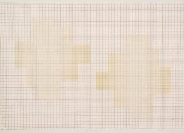 Curator: There's something so soothing about this untitled piece by Peter Stroud, created in the 20th century. It’s part of the Tate collection, a print featuring layered geometric forms in soft blues, browns, and yellows. Editor: It feels almost like a schematic, or maybe a floor plan stripped of all its architectural purpose and left with the bones of pure form. It's intriguing how the colours interact. Curator: Absolutely. Stroud was interested in how colour created spatial illusions, and here, the gentle shades create a subtle sense of depth, almost like looking into a hazy distance. The way the colors shift at each edge is so delicate! Editor: And that repetition, the way the shapes echo each other, feels almost meditative. I’m thinking about the legacy of formalism, how this stripping-down echoes broader social desires for order. Curator: Yes, there’s a calming structure to it, a feeling that everything is in its right place. But then, the subtle variations hint at something more organic, a gentle breath within the rigid lines. Editor: Thinking about minimalist aesthetics, this piece almost makes you consider how geometric forms could be considered a visual language for the powerless, offering structures of meaning amidst the chaos of everyday life. Curator: Perhaps it is about searching for some kind of peace within the chaos of our own thoughts. A welcome place for the mind to rest.