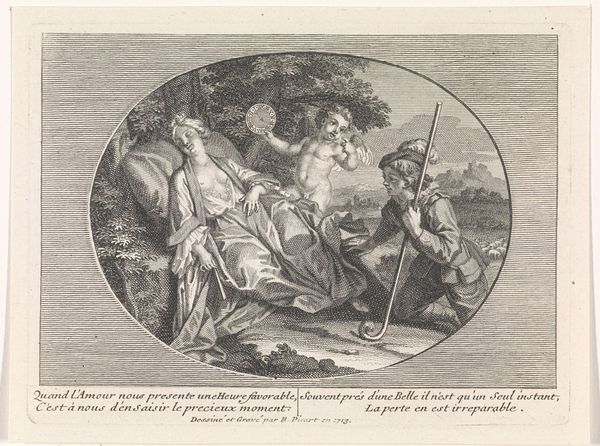 Curator: Bernard Picart's "Voyagers to the Island of Cythera," etched in 1708. It’s currently housed here at the Rijksmuseum. Editor: Immediately, the texture pulls me in. The stippling, the delicate lines—it all gives the scene a shimmering, ethereal quality, doesn't it? Like a dreamscape about to dissolve. Curator: Absolutely, the very method chosen suggests ephemerality. And of course, Cythera. For centuries, this island was symbolic of love and earthly delight. Note the elegant figures ready to step onto the shores. Cupid leading the way, bearing a torch. The couple each seem to carry totems relating to Aphrodite, or Venus. Editor: I find it charming—this image of embarkation to a fantasy destination of complete freedom, a kind of promise held out. Look at how assured those figures are—though Cupid seems weighed down by the torch! There’s an understated drama. They are not overwhelmed; there's serenity. Do you think that makes it an aspirational piece or one commenting on idealized romance? Curator: Both. The overt classicism tells me Picart isn’t simply selling a shallow fantasy. Pilgrimages imply devotion, intention, self-transformation. This voyage seems less about instant gratification and more about entering a heightened state of being. The fact that Bacchus joins the travellers underlines the journey towards transformation, and elevation. Editor: But I can’t shake the feeling there is an underlying knowing irony. This isn’t presented as unblemished joy. Curator: Indeed. Even paradise has its nuances, right? What truly resonated for me were those small ships, barely visible behind them. Such an intricate way to depict that yearning, but in monochrome. A yearning, after all, remains partially veiled. Editor: It’s this very veiling that creates such lasting magnetism. A whisper of the impossible. What I found striking is how, at first, I took that background to be rocks but with time came to accept those representational forms of the sea. Now, it resembles our very longing as it ebbs and flows through the waters of time. Curator: Ah, a shared horizon where desire and representation converge!