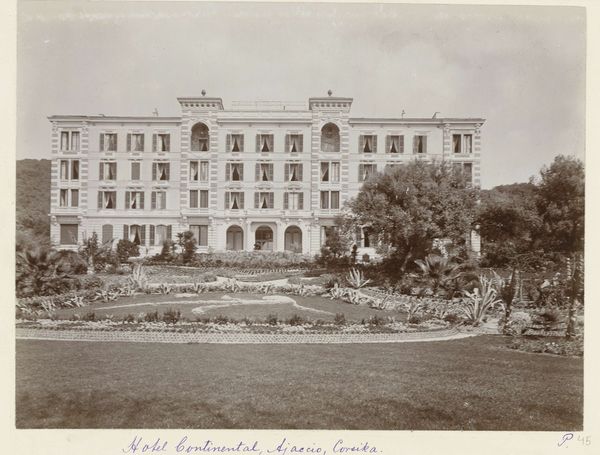 Curator: Welcome. We're looking at an albumen print by Johannes Lodewijk Heldring from 1898, titled "Tuin van het Shepheards Hotel in Caïro," depicting the garden of the Shepheard's Hotel in Cairo. Editor: My first impression is one of subdued elegance, with its muted sepia tones and the orderly yet overgrown quality of the garden. The high vantage point gives the composition a layered feel, almost theatrical in the way the garden leads up to the hotel. Curator: Absolutely, it’s important to consider the layers here—both in the image and historically. Heldring was part of a wealthy Dutch family, and photographs like this reflect a specific Western gaze on Egypt, popular during the Orientalist movement. The hotel itself was a symbol of colonial luxury and a meeting point for European travelers and elites. Editor: I’m struck by how Heldring has carefully arranged the elements within the frame. The verticals of the palm trees contrast with the horizontality of the building, creating a sense of balance and visual rhythm. And then there’s the texture—the feathery palm fronds, the dense foliage, the smooth facade of the hotel—each captured in exquisite detail through the albumen process. Curator: Those palm trees become like sentinel markers between cultivated spaces. In this image they invoke not just place but a period; the hotel represented adventure and discovery but also the imbalanced power structures of that time. Its later destruction, well after this photo was taken, is poignant given its symbolism of luxury and colonial presence. Editor: Precisely. The photograph serves as a carefully constructed tableau. What at first seems like a candid snapshot is revealed, upon closer inspection, to be a considered study in light, form, and texture. It documents a place, a time, and perhaps, an ideology. Curator: Indeed, its lasting appeal invites us to think critically about the complex relationships between travel, representation, and historical memory. It offers both aesthetic pleasure and historical inquiry. Editor: Well said. It leaves you wondering what unfolded both inside that legendary hotel and in the world outside its doors at that very moment.