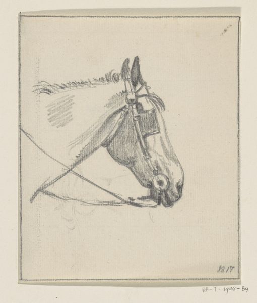 Jean Bernard made this sketch, "Head of a Horse with Blinders, Facing Right," with graphite on paper. Although undated, the presence of blinders asks us to consider the historical and cultural treatment of animals. Horses were essential for transportation, agriculture, and warfare. Bernard's sketch prompts us to consider the intersection of labor, control, and the natural world. The blinders symbolize a restriction of vision and freedom, reflecting a human desire to control and direct the animal’s energy and labor. While horses were important for societal development, their individual experiences of labor were often overlooked. This is in parallel to the labor of the working classes during the industrial revolution. How does this image resonate with our contemporary understanding of the relationship between humans, animals, and labor? What does it mean to limit another being's perspective in order to harness their power?