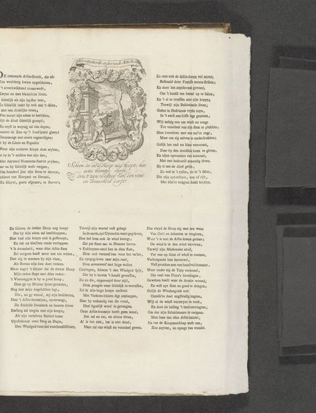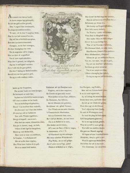 Editor: We're looking at "Bronwater als geneesmiddel voor de zieke Actionisten, 1720," made between 1697 and 1720 by Pieter van den Berge. It's an engraving on paper, and its current home is the Rijksmuseum. What strikes me is how the image is cradled within all that text. It almost feels like we are peering into a secret emblem. How do you interpret this work? Curator: The power of an emblem, you say? Good. Because this isn't simply a pretty picture nestled within text. This print reveals a fascinating cultural moment tied to speculative bubbles. The “actionists” referenced in the title were essentially early investors caught in the South Sea Bubble frenzy. Editor: Ah, so it's satirical? Like a warning about financial excess? Curator: Exactly! Think of water as a symbolic cleanser – and here, a curative for the "sick actionists" suffering from investment fever. Water is purification but also potentially ruinous, like a flood. Note the prominence of that central female figure – she is an allegorical figure dispensing or promising relief, perhaps deceptively so. It would be helpful to consider this from our contemporary financial perspective. How have symbolic images shaped opinions and actions regarding the economy? Editor: I see! The symbols aren't just pretty; they’re active participants in a dialogue about value, health, and maybe even morality. Curator: Indeed. And remember, prints like this circulated widely, shaping public opinion through accessible imagery and text. Consider the emotional weight attached to financial terms or visual metaphors used in news today. Editor: That's a great point; I hadn't considered how powerfully these symbols work even now. Thanks, this has given me a whole new way of seeing.