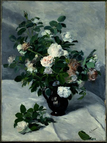 Curator: Let's turn our attention now to "A Vase of Roses," painted by Vincent van Gogh in 1890. A little bit of sunshine in a vase, if you ask me. Editor: Sunshine fading, perhaps? My first thought was how much the pale roses pop against that saturated green. There's a fragility here that feels, well, melancholic. It's interesting since it comes from an artist we commonly think of as vibrant. Curator: Absolutely, the vibrancy is still evident in the thick impasto technique Van Gogh employed here. The brushstrokes themselves are almost sculptural, like little mountains of paint conveying life, but also perhaps hinting at impermanence. Roses, especially, have a long association with beauty and its fleeting nature, what the Greeks referred to as *akmé* and *pompé*, splendor as its height. Editor: Yes, you can almost feel the wilting even as the paint is practically jumping off the canvas. But those strokes, I get the mountain metaphor. Like they're fighting against gravity, striving upwards even as they droop. Makes me wonder what Van Gogh was fighting against at that moment. Curator: Indeed. Painted during the artist's stay in Saint-Rémy, not long before his death, the roses become a compelling symbol. Remember that many cultures consider roses the symbol of death and resurrection and can often be found at funerals. I think there's a profound symbolic weight that goes beyond simply capturing the beauty of a floral arrangement, this being roses instead of a random flower in a field, say. Editor: It’s like a portrait of transience itself, painted with a desperate urgency. The vibrancy doesn't diminish that sense, though. Maybe it even intensifies it. You get this sense that he's not just painting roses, but mortality. Curator: And life and death exist in tandem, with art rendering even greater meaning to our lived realities and the cycles we inhabit. Editor: Exactly, like a memento mori in full bloom, almost screaming. Okay, I think I need to go stare at something completely different now, like one of his sunflowers. Curator: Agreed. This might be a painting that makes you think deeply. Thank you for your insights.