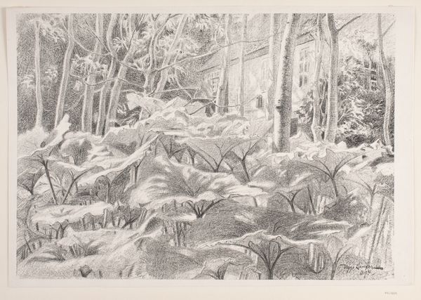 Editor: Here we have Kees Stoop's "Blad met vier kaders waarin boslandschap," a graphite drawing created sometime between 1939 and 2009. The realism is quite striking. It feels both familiar and a bit unsettling with the four fragmented perspectives of the same woods. How do you interpret the symbols or messages embedded within this seemingly simple scene? Curator: The use of the forest is compelling, and fragmented scenes act almost like memory itself, don't you think? For centuries, the woods have served as potent symbols within the cultural landscape: a space of mystery, danger, and spiritual awakening. In folklore and fairy tales, forests are where transformations happen, where characters confront their deepest fears and find their true selves. Does the choice of rendering it in monochrome and breaking it into quadrants alter the symbolism, perhaps grounding it in lived experience? Editor: That’s a fascinating point about memory! The monochrome palette definitely lends a somber, almost dreamlike quality. The breaking up into quadrants... perhaps suggests fragmented memories or multiple perspectives on a single place, distorting any clear reading of a continuous, reliable scene. Do you see a relationship to wartime anxieties, perhaps reflecting the artist's experience during that period, given the dates? Curator: Indeed. The division could be a visual representation of a mind trying to make sense of a disrupted world. Each panel captures a specific, limited viewpoint, emphasizing the subjective nature of observation. Graphite, the medium itself, suggests the act of recording, almost like preserving a fleeting moment before it disappears. The lack of color may amplify feelings of uncertainty. Can you perceive that the seemingly placid scenes invite darker associations of nature and uncertainty in their abstraction? Editor: Absolutely, now I do. Initially, the landscape felt almost generic. Now I appreciate how those formal choices enhance the symbolism and the overall emotional impact. It’s a landscape not just seen, but experienced through a specific lens of time, place, and perhaps trauma. Curator: Precisely. Art often invites us to see beyond the immediate and consider the deeper, sometimes hidden layers of meaning embedded within familiar forms and images. Recognizing this artistic language enables the viewer to appreciate art in an intimate way.