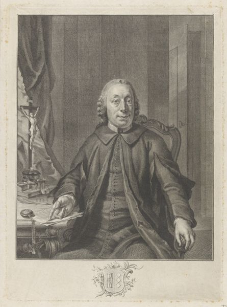 Curator: Jonas Haas created this engraved portrait of Nikolaus Ludwig von Zinzendorf in 1750. The detail in the rendering of fabric is remarkable. Editor: It has such a formal and reverential feel, doesn't it? Almost austere, yet that light from above softens his face and that open book…intriguing. Curator: Engraving as a printmaking technique requires considerable skill; the act of incising lines into a metal plate to hold the ink reveals an expertise reflecting Zinzendorf’s own standing and status as a theologian. It speaks volumes about how this image would be distributed to disseminate his teachings. Editor: Precisely. The open book practically invites the viewer into Zinzendorf’s theological world. He was, after all, a key figure in the Moravian Church. Notice how his gaze is directed just beyond us. What truths does he contemplate, and what message are we meant to take from this careful staging of scholarly intent? Curator: Absolutely. The very act of creating and distributing this kind of portrait highlights Zinzendorf’s central role and the deliberate construction of a public persona, much like branding nowadays. Who was commissioning this piece, who would acquire and disseminate it, and where would it circulate? All of this speaks to power structures. Editor: Power certainly. And remember that Baroque art used dynamism, exaggerated motion, and clear, easily interpreted detail to produce drama and grandeur. That open book, the light, his composed expression, they draw us into this moment. It's not simply about conveying status; it’s about presenting Zinzendorf as a source of spiritual authority and enlightenment. It’s a potent blend of visual rhetoric. Curator: Well put! Examining the layers of labor involved gives us more insight into its cultural weight as an object in society. Editor: Indeed. The enduring power of visual symbols and their resonance through time!