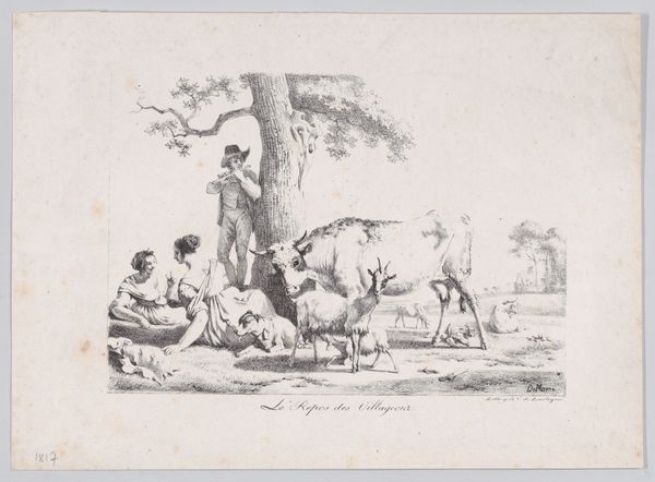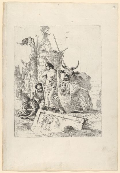 Curator: What a wonderfully serene pastoral scene! This is a Dutch Golden Age engraving by Abraham Jansz. Begeyn, likely created between 1647 and 1697. The work is called “Herder staat bij koe en twee geiten bij vervallen muur,” or “Herder Standing by Cow and Two Goats Near a Collapsed Wall." Editor: My first thought is the stark contrast. It’s such a high contrast image. It feels kind of empty, though. Very quiet. There's a notable contrast between the shaded figures and the bare landscape. Curator: Indeed, the piece definitely embodies that Golden Age aesthetic, a realism centered around genre-painting combined with elements of a landscape, and printed through the techniques of engraving, etching and drawing with ink. We can see that rural life was clearly a source of interest and value during this period, and, furthermore, its accessibility as an etching surely indicates a far reach to lower- and middle-class households. Editor: Looking at the composition, I see how the figures create this sense of space, like a shallow foreground. Then your eye goes back to a pretty undefined background, and you get a feeling of depth, especially given how much the human figure seems lost or small, relatively. The animals and the shepherd lean to one side while this architectural feature, this wall, grounds them almost like an altar. Curator: That collapsed wall does seem significant. Ruins were romanticized during this period, you know. They speak to time passing, the impermanence of human structures against the enduring natural world. It brings this rustic quality, which must have made it popular even as a piece for wealthier individuals looking for rural subject matters. I'd venture the collapse gives the feeling that the world isn’t stable, the way genre-painting is traditionally viewed. Editor: I find the engraving very detailed. Consider the textural rendering, too! The rough fur of the animals versus the crumbling stone of the wall, and how different line techniques communicate those surfaces, adding to the naturalism but also to the contrast within the entire print. There’s movement created within an otherwise static scene. Curator: You've got an excellent eye for that texture! It all serves to remind us of the realities of Dutch life. We need to remember, in a lot of genre painting from the time, that these artists are using the landscape for some type of didactic social message. Maybe the purpose here is as simple as portraying harmony through pastoral life? Editor: Yes, or a way to contrast human artifice and decay with animal endurance. That cow seems pretty content, all things considered. Thanks for bringing this history to the fore! It really does re-orient the scene within a different world, with meaning more than just as pretty images. Curator: Thank you! By delving into its social and cultural context, the piece resonates beyond its pleasing aesthetics. It is always beneficial to consider what social and art values were, during the time of a piece’s inception.