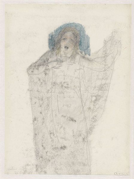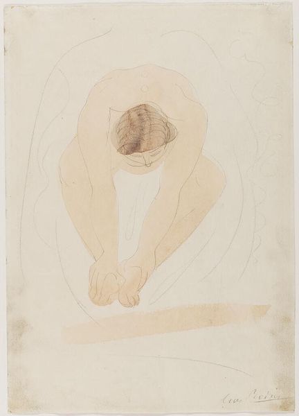 Curator: Immediately, the looseness of the sketch gives it a sense of movement. Editor: This is a watercolor and graphite drawing called "Draped Female Dancer," attributed to an imitator of Auguste Rodin, and currently residing at the Harvard Art Museums. Curator: The drapery, rendered in deep red, almost seems to constrict the figure rather than adorn it. What could the implications be on the body, perhaps reflecting societal constraints placed on women? Editor: I'm struck by the visible process – the underdrawing in graphite, the washes of color building form. There’s a raw, unfinished quality that reveals the artist’s hand. The material itself speaks to the physical act of creation. Curator: Yes, and that rawness, that sense of the figure struggling, maybe links to broader themes of female representation in art history. The body is almost like a battleground. Editor: Interesting point. Looking at the paper itself, the way the washes pool and stain, almost like fabric dye, suggests a connection to textile production, to the labor of dressing and undressing the body. Curator: I hadn't considered that. It's amazing how such a seemingly simple sketch can hold so many layers of interpretation. Editor: Indeed. Examining art through material and historical lenses can really open up new ways of seeing.