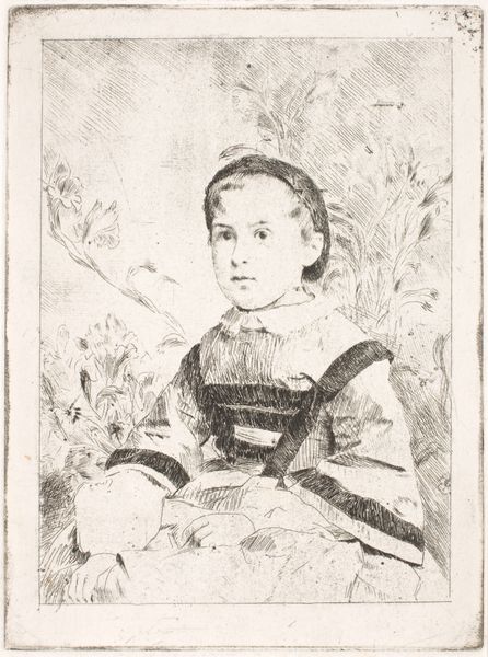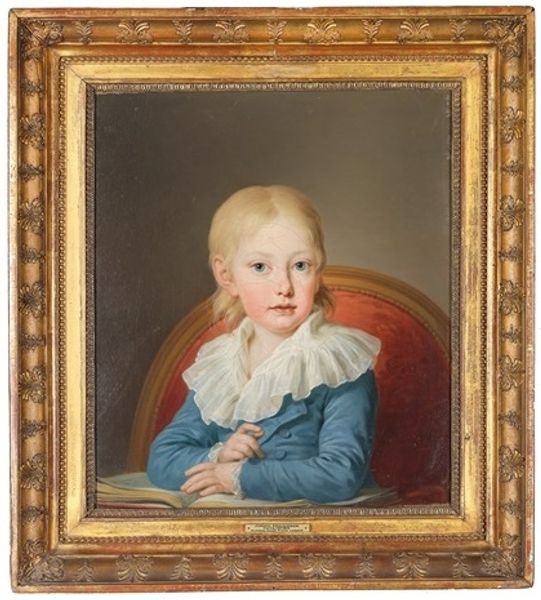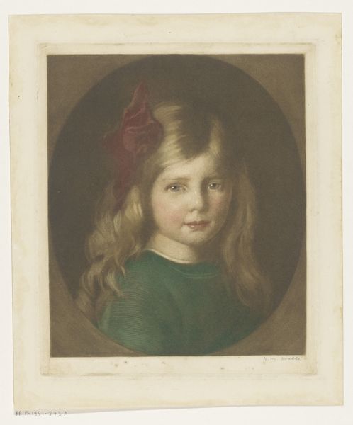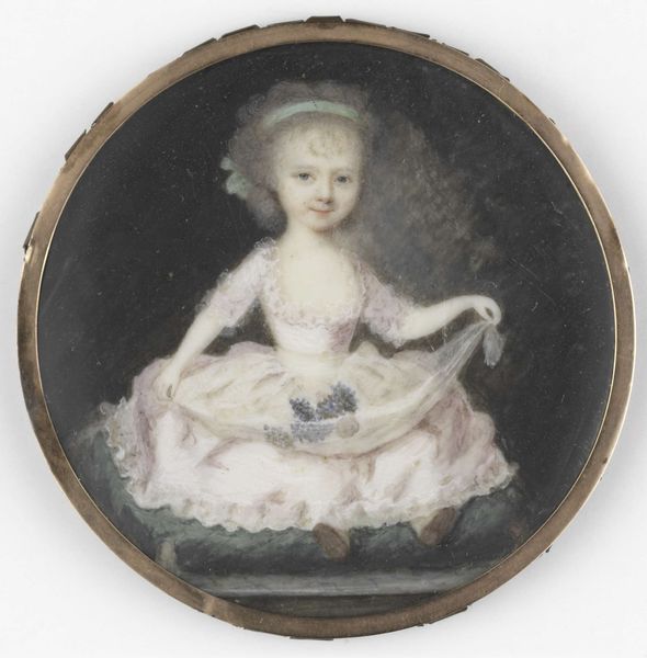 Curator: Stepping into this space, we encounter a beguiling image: *Portrait of a Girl with Blue Eyes and Blue Dress*, believed to have been created around 1820 by B. Doyle. It's executed in watercolor and oil painting. Editor: It’s rather haunting, isn’t it? The color palette, predominantly cool blues and muted grays, creates a somber, almost ethereal atmosphere. The composition, with the girl centrally placed, seems rigidly formal, yet the translucent texture somehow softens it. Curator: Precisely! Doyle uses light quite skillfully to give form to the girl’s pale complexion and her striking eyes, drawing our gaze. I sense an exploration into a romantic aesthetic here; almost as if we have intruded upon a delicate, private moment. Do you perceive that in the same way? Editor: Undeniably. I would point to the semiotics of Romanticism at play: consider her dress, which is rendered as a pastiche, or the small book clasped in her hand; all contributing to the image's structural harmony, where symbolic elements enhance its thematic unity. It evokes that melancholy contemplation characteristic of Romanticism, and even an early version of surrealist aesthetic. Curator: That's really acute observation, because if you observe the slight upturn of her mouth and almost stern expression. One would assume the moment would come across different. Is there any specific facet that lingers for you? Editor: The materiality fascinates me. Doyle manages to blend a cool, rational formality with these almost hyper-realistic strokes of Romanticist impulse. I'm also thinking of those stylistic brushstrokes – each contributing to a sense of distance and emotional restraint. It's the artist's careful arrangement of the color palette itself, though muted, creating an enduring harmony and almost transcendent depth to the gaze. Curator: Well, in conclusion, this portrait invites introspection. Perhaps the girl is contemplating some weighty tome! Editor: A remarkable synergy emerges from the painting’s construction: emotional restraint, philosophical depth, aesthetic beauty, a glimpse into a fleeting expression… a timeless question.