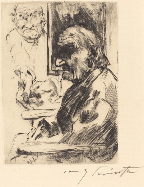 Curator: Well, doesn't this just evoke a cozy sort of gloom? I can almost smell the cigar smoke coming right off the print. Editor: We're looking at an etching by Dwight Case Sturges entitled "Canfield." There's no date listed, so pinpointing its place within Sturges' oeuvre will be a bit of an adventure for art historians. Curator: You know, the first thing that struck me was just how intimate this feels, even though it’s a print. The way the artist captured the gentleman's focus... you can tell he's deeply engrossed in his game. Wonder if he's winning? Editor: The composition is rather intriguing. See how the lines converge toward the center of the table, leading the eye directly to the arrangement of the cards? It establishes a definite focal point and controls the visual narrative quite cleverly. Curator: Oh, absolutely. And it’s loose, you know? Almost as if Sturges captured him on the fly, which I think is neat given how stuffy portraiture was for, well, forever. Editor: Precisely. Sturges adeptly uses the medium of etching to play with light and shadow. Observe the delicate cross-hatching technique in defining the contours of the figure, in contrast with the stark, unadorned planes. It creates a marvelous atmospheric depth. Curator: Gives it a very dreamy feeling, almost as if we’re looking in on a memory. What I like is, it’s also kind of meditative. It feels real. This etching reminds me of a quieter, simpler kind of joy, like those winter afternoons playing solitaire with my grandpa. Do you play Canfield? Editor: That resonance is potent. What stands out for me is the formal relationship between representation and abstraction. Although the subject matter is recognizable—a man absorbed in a game—Sturges abstracts the details, emphasizing tonal qualities, form and line. Curator: Absolutely! You know, for me, the power of art really lies in those moments where something concrete unlocks something deeply personal, and this just, sort of, gets right there! Editor: An astute observation, perfectly underscoring Sturges' remarkable skill!
