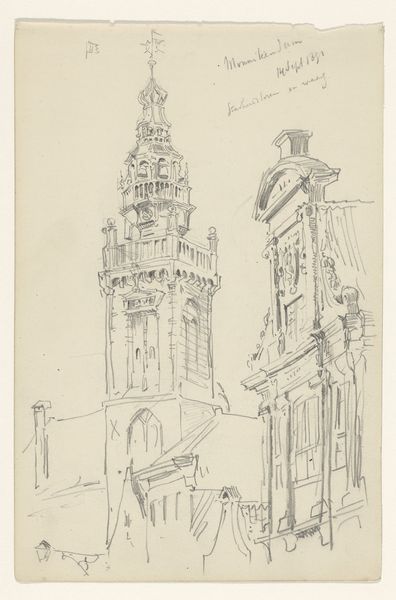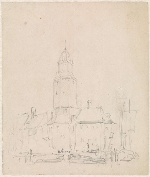 Cornelis Vreedenburgh made this drawing of the Montelbaanstoren in Amsterdam using pen and ink on paper. Vreedenburgh's choice of materials and technique—pen and ink—is notable for its directness. Unlike the layered, painstaking processes of oil painting, ink drawings prioritize spontaneity. Look closely, and you can sense the quick, decisive movements of Vreedenburgh's hand, capturing the tower's architectural form with a mix of precision and gestural energy. The ink lines vary in weight and density, which suggests an immediacy in capturing the tower. The paper's texture also plays a role, interacting with the ink to create subtle variations in tone and texture, enlivening the surface of the drawing. The drawing speaks to a social context where rapid urbanization and industrialization were reshaping cities. Artists like Vreedenburgh documented these changes, but also remind us of the human labor involved in constructing and maintaining these urban landmarks. Appreciating the material qualities of this drawing allows us to see it not just as a representation of a building, but as an index of the artist's engagement with the built environment.