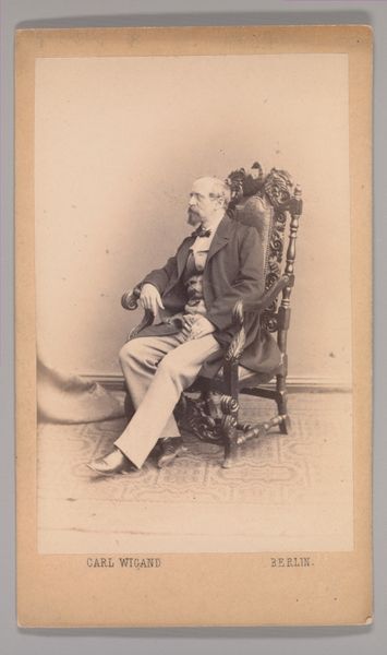 This is a photograph of Edward William Cooke by John and Charles Watkins made in the mid-19th century. It captures the artist in a moment of contemplation, hand to his face, seated next to a small table with books. Cooke, a Royal Academician, was known for his maritime paintings, reflecting Britain's naval power and colonial expansion during the Victorian era. This image, however, offers a more intimate view. What does it mean to see an artist known for grand seascapes in such a domestic setting? Consider the burgeoning photography industry at this time, and its role in documenting and shaping identities. The Watkins Brothers' studio catered to the elite, reinforcing social hierarchies. Yet, this portrait also hints at the individual behind the public persona, inviting us to reflect on the complexities of identity and representation in a rapidly changing world.
