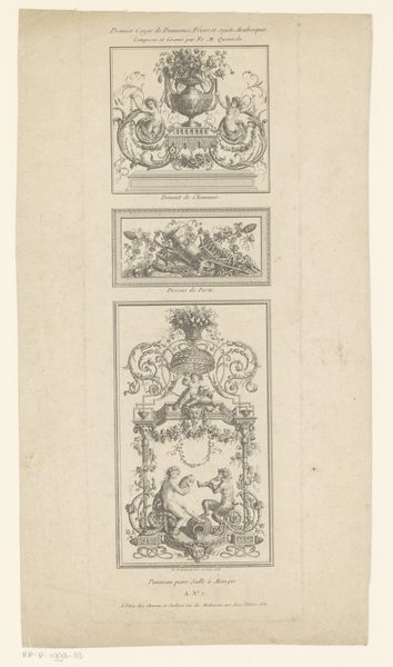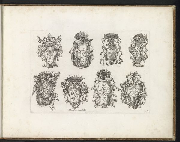 Editor: Here we have *Vier decoraties met gezichten*, or "Four Decorations with Faces," created sometime between 1704 and 1737 by an anonymous artist. It's an engraving – a print – and it features four distinct, almost medallion-like designs. What strikes me is the repetition of faces but with such different symbolic frameworks. How do you interpret this work? Curator: It's a fascinating piece in terms of iconographic layering. Consider the period: early 18th century. What does the inclusion of classical motifs, mixed with burgeoning Baroque aesthetics, suggest to you? Each face, though seemingly a portrait, functions more as an allegory. The surrounding imagery becomes a language. Editor: So, the faces aren’t necessarily specific people, but types? What language are these visual symbols trying to communicate? Curator: Precisely! Think about what attributes are traditionally associated with figures from mythology or even societal roles. Note the distinct symbols flanking each face: weapons, foliage, keys... These aren't random. Keys could allude to governance, wisdom, or secrets, for instance. And what feelings do the arrangements and juxtapositions of symbols evoke? Editor: That makes sense. The face with the keys feels much more serious, authoritative even, than the one surrounded by flowers. I guess they are representing different concepts rather than individuals. Curator: Indeed. And even the medium, engraving, speaks to a desire for reproducibility, a widespread dissemination of these ideas. These "decorations" were meant to instruct, to remind the viewer of certain virtues, or principles. The imagery works on conscious and subconscious levels, shaping perceptions of order, authority and, indeed, beauty. It’s cultural memory in visual form. Editor: I see! So, the artist wasn't just creating decoration; they were actively participating in the cultural discourse of the time. That changes how I view the artwork completely. Thanks.