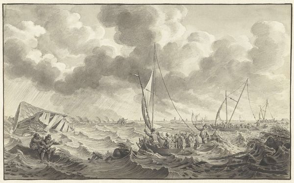 Curator: Welcome. Before us hangs Pieter Idserts’s drawing "Zeegezicht," dating from the 18th century. A subtle, captivating work rendered in pencil. Editor: It’s...restless. Even in the grayscale, the water roils with energy. I feel the dampness in the air, the struggle of those distant ships against the elements. Curator: I agree, it conveys that feeling exceptionally well. Consider the physicality of drawing itself; graphite on paper is a deliberate act, each stroke responsive to the surface, pressure, and intent. I wonder, what paper would Idserts have used? Did the texture influence his rendering of those churning waves? Editor: Probably. It wasn’t cheap, decent drawing paper. A sketch like this would’ve been an exercise, perhaps a study for a larger work or a commission of some kind? Look how meticulously he’s defined the cloud forms. Curator: I find the tonal range fascinating. There’s almost an absence of truly deep black; the grays breathe, giving the scene an atmospheric perspective that heightens the vastness of the sea. Editor: True, it feels boundless, all-encompassing, but notice the way the horizon line isn't straight and how that suggests the fragility of human endeavors against this maritime immensity. I can imagine it reflects how a ship builder like Idserts might observe such dangers but see the beauty nonetheless. Curator: That touch of humanity amidst all that turmoil! Also notice how lightly he’s rendered the distant coastline compared to the energy of the immediate waves. Editor: Maybe those vessels were fishing boats from Idserts's own locality; for an artisan like him, this seascape becomes less of a detached romantic spectacle and more a direct representation of their workplace and livelihood, and perhaps an exercise in capturing it realistically. Curator: Absolutely, there's that personal connection woven into the work. Seeing through that lends depth to the sea that stretches before us. Editor: Well, I'm off to imagine building model ships to weather my own storms today! Thanks, Pieter!