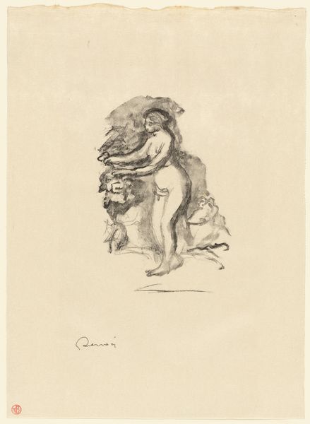 Paul Gavarni created this drawing, "Voddenraper," with pen and brush in gray ink. The artist composes the figure using contour lines and cross-hatching, to depict the texture and material of the ragpicker’s garments. Gavarni destabilizes established social categories in the formal construction of this work. The man is bent under the weight of his labor. His face, partially obscured, suggests anonymity, highlighting the universal struggle of the working class. The dark lines emphasize the tattered clothing, a visual signifier of poverty and marginalization. The composition challenges conventional representations of the working class. It invites viewers to reflect on the social structures that perpetuate inequality. The figure is not romanticized but presented with a raw honesty that invites empathy. This work functions not just aesthetically but also as a larger commentary on social injustice.