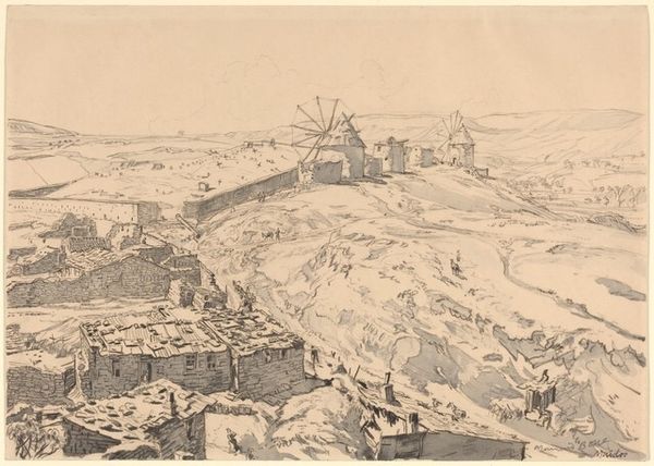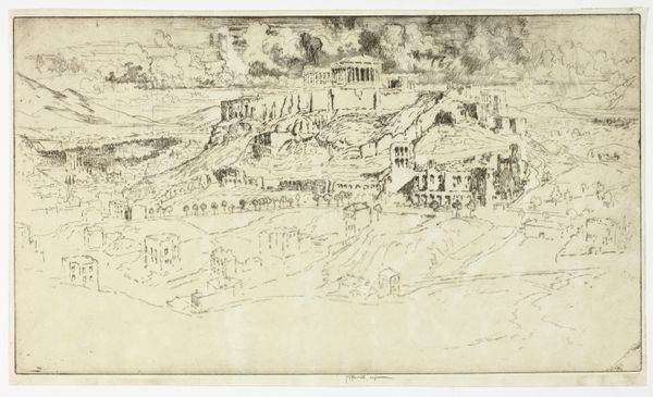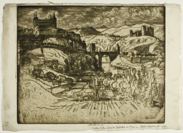 Curator: Let's consider this intaglio print by Anton Lehmden, "Tiber Island," created between 1960 and 1961. Editor: My initial reaction is of unease, almost a vorticist churning. The hatching creates an overwhelming sense of movement. Curator: Indeed. The dynamism is achieved through his precise technique. Note how the swirling lines both define the Tiber River and create a sense of spatial distortion. Consider, too, the formalist elements. The composition itself divides the island into defined geometric masses; notice how Lehmden balances these masses with the texture and intricate crosshatching. Editor: But there's also something inherently historical here. The subject, Tiber Island, with its ruins and bridges, has always occupied a significant spot in the city’s spatial rhetoric, used as a location to exert imperial powers onto the people of Rome. The vortex, for me, illustrates the sweeping power held in this central hub. It isn’t just aesthetics, but the power play being expressed through imagery. Curator: That socio-political interpretation works. He certainly understood how to exploit the contrast between line and void. See how that plays out not only formally, to articulate volume, but also conceptually, allowing space for interpretation of political intention, or any subtext for that matter. The materiality here--etching, the lines on the plate--that interplay shapes how we read the overall image. Editor: The choice of such a historical landmark is also, I think, pertinent. Consider how prints were and are democratized; the wide production invites open and free consumption, and a political reading of art is enabled. Curator: A powerful confluence of history and aesthetic principles. Editor: Agreed. It compels a reassessment of spatial arrangements and political forces, doesn't it?
