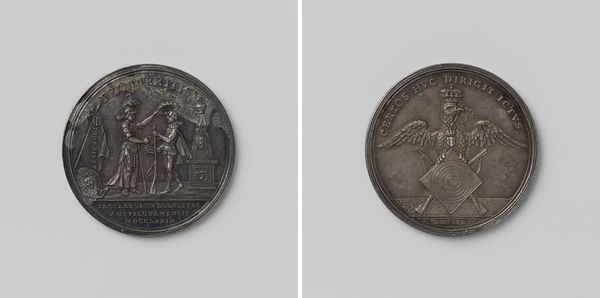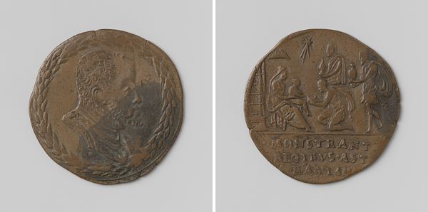 Editor: Here we have a bronze medal of Domenico Malatesta, called Novello. It's an anonymous work, and quite small. I am struck by the contrast between the regal portrait on one side and the more humble scene on the other. How do you interpret that contrast? Curator: It speaks to the complex public image Novello wanted to project. The portrait, with its classical inscription, emphasizes his authority. The reverse, however, shows a scene that could be interpreted as either religious devotion or, perhaps, a victory scene. Editor: So, it's about managing perceptions of power? Curator: Precisely! Renaissance rulers were very deliberate in crafting their image. Medals like this were a key part of that strategy. They served as portable propaganda. Editor: That makes me see it in a whole new light. It’s a carefully constructed narrative. Curator: Exactly. And considering the historical context helps us understand the choices that were made.