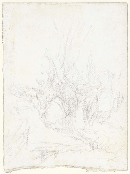This drawing by Andreas Schelfhout captures skaters on a frozen canal beside farmhouses using pen and brush in gray ink. At first glance, its monochromatic palette and delicate lines evoke a sense of serenity. Schelfhout organizes the composition into distinct zones: the detailed foreground with bare trees and rural buildings contrasts against the more open and linear background, where skaters become mere suggestions. The artist's linear precision, particularly in rendering the architectural elements, and the bare trees, creates a structural framework that divides the image into near and far spaces. This division is not just spatial, but also semiotic; the detailed foreground invites immediate reading, while the background requires a more interpretive gaze. The drawing, therefore, challenges fixed notions of landscape, asking us to consider how lines and forms construct our understanding of space and representation.