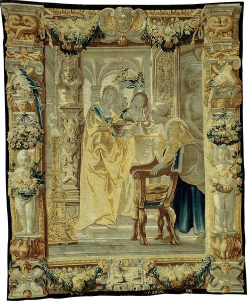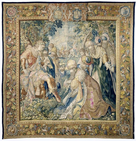 Curator: This textile hanging is "Adoration of the Kings," likely woven between 1525 and 1535 after a design by Bernard van Orley. The scene is rich in detail. What are your initial thoughts? Editor: I'm immediately struck by the opulence, the sense of overwhelming texture. The scene feels almost staged, like a Renaissance pageant intended to impress, doesn’t it? Curator: Absolutely. And consider who this was meant to impress. Tapestries such as these were powerful status symbols. They demonstrated wealth and taste. The history of tapestry as a medium speaks to complex socioeconomic and political narratives; the ownership, the display, and of course, the creation… Editor: Speaking of creation, I am intrigued by the representation of the Magi. Look at their attire! These aren’t simple shepherds, but rulers, perhaps reflecting the patrons for whom this was woven. In terms of the message, does it not tell us about power dynamics and the justifications used to uphold social order during this period? Curator: Precisely. These tapestries functioned as a form of visual propaganda, reinforcing the divine right of kings and the social hierarchy. Notice the floral border and the incorporation of classical architectural elements, which blend religious narrative with secular grandeur, reinforcing these established ideals. Editor: So, not just a beautiful scene, but an assertion of power through image and material. I'm particularly drawn to the representation of Mary and baby Jesus. Her posture, so serene despite the surrounding grandeur... It creates a fascinating contrast, challenging us to consider the multiple layers of meaning embedded within this textile. How does one reconcile a religious narrative that challenges existing power with this overt display of material wealth and the powers it holds? Curator: It highlights inherent tensions within systems of power. Art, in many ways, reveals and reflects on those disparities through carefully coded and constructed displays. Tapestries like these were tools to display ideologies and invite continued, often crucial questioning. Editor: This close looking reminds me to question, not just admire, the past. Thank you for the deeper understanding. Curator: It's in understanding art's roles that we equip ourselves to critique and build upon inherited narratives and beliefs.