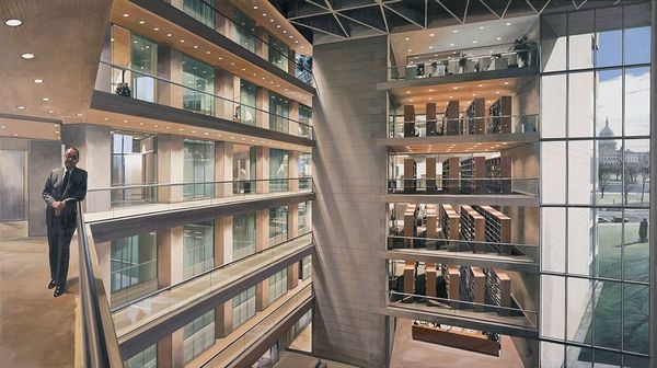 This drawing of the Farmers and Mechanics Savings Bank, created with watercolor and graphite, captures the building's imposing presence through a mix of precision and atmospheric washes. It's like the architects are thinking through the building-making process, right there on the page. The creamy, pale hues give the building a kind of soft glow, contrasting with the sharp, ruled lines that define its structure. Look at the way the light seems to skim across the facade, highlighting the subtle gradations in tone. There's a real sense of depth and space, but also a flattening effect. It's not photorealistic, but more about capturing the essence of the building’s design. See how the windows are rendered with such care, each one a small rectangle of reflected light? It’s almost meditative. The play between representation and abstraction reminds me of Giorgio de Chirico, who also used architectural motifs to create emotionally charged, dreamlike spaces. Ultimately, this drawing is a testament to the power of art to transform our perception of the built environment.