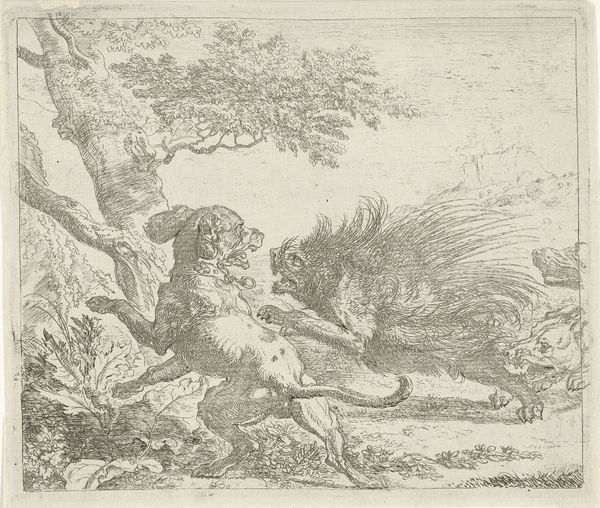 Editor: This is "Liggende leeuw opzij kijkend," or "Lying Lion Looking Sideways," a pen and ink drawing with etching by Marcus de Bye from 1664. It’s held at the Rijksmuseum. I find the lion's expression quite intriguing; he looks almost melancholic, as though burdened by the weight of his own power. What do you make of this depiction, especially considering its historical context? Curator: That's a great starting point. I think it’s important to look at the lion not just as a symbol of power, but through the lens of the Dutch Golden Age, when overseas trade and colonialism were on the rise. The lion, traditionally a symbol of royalty and dominance, also became associated with the Dutch Republic itself. However, consider the subtle critique inherent in portraying him as pensive or even weary. What power dynamics are at play when the symbol of imperial authority is presented with such nuanced vulnerability? Editor: That’s fascinating. So, it's less about celebrating strength and more about questioning the implications of that power? The positioning in the landscape suggests a vulnerability in a world not fully controlled. Curator: Exactly. And thinking about the animal as a commodity for display in wealthy households through colonial trades, can influence the interpretation as well. This also invites us to consider this creature in a Dutch setting, when they aren't naturally indigenous. The work encourages critical reflection, and considering what has been left out, or implied, within the work. Who benefits from this representation, and who might be marginalized or silenced by it? Editor: I hadn’t considered the social and political commentary embedded within what seemed like a simple animal study. Thanks, that was very helpful! Curator: Absolutely. It shows us how even seemingly straightforward images can reveal a great deal about a society's values and anxieties.