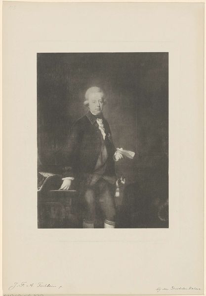 Editor: This is Charles Rolls's portrait of Benjamin West. I find it compelling how West is positioned with his own painting—what significance do you see in this mirroring? Curator: The placement speaks volumes. West stands as a master, but the unfinished canvas alludes to the continuous act of creation. Consider the cultural weight of representing an artist alongside their work. What echoes of self-perception and legacy do you detect? Editor: I see the statement on legacy, but I also wonder about the inclusion of the canvas—does it also function as a kind of personal symbol? Curator: Precisely! It is both a reflection of craft and a symbol of artistic identity. Rolls uses the painting within a painting to suggest the interconnectedness of the artist, his vision, and his enduring contribution to the cultural landscape. It is a powerful reminder of the layered meanings inherent in visual representation. Editor: That's fascinating, I never thought of it that way. Thanks!