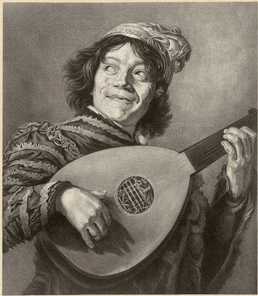 Curator: The mood here feels immediately jovial, doesn't it? The warm light, the playful gaze... there's a lightheartedness that's quite striking. Editor: Absolutely. And in that spirit, let's explore Frans Hals’ “The Lute Player,” painted around 1623-1624. It's oil on canvas and resides here at the Rijksmuseum. Curator: Look at how he uses paint! The fabric looks almost… edible. And notice the rapid brushwork capturing the fleeting expression—it's all so immediate, like a snapshot. Editor: This immediacy also reflects broader social shifts. Paintings like this were made for the burgeoning merchant class, eager for genre scenes reflecting everyday life. Consumption wasn’t just about necessity; it was increasingly about displaying affluence through the art one chose. Curator: True, though I wonder about the societal implications embedded in seemingly "everyday life". The figure’s costume seems intentionally…performative? What can it reveal? Editor: Exactly. The clothing blurs class lines, gesturing towards both wealth and theatricality, making the subject someone seemingly caught between social categories, perhaps an entertainer catering to that growing bourgeois market, or somebody appropriating clothes or acting as a character who he really isn’t. Curator: And what about the lute itself? An object made and sold to consumers... who were the luthiers crafting them, what was their class, and did they reap any profits when paintings featuring these items became hits? Editor: Good questions. The lute was often associated with leisure, courtship, but also potentially seen as… frivolous, and the painting challenges that a little. By presenting a musical, lively image, it subtly contests the rigid morality often associated with certain social strata. There are complex politics woven in this ostensibly happy tableau. Curator: Ultimately, Hals' work, like many, acts as a site of confluence where raw material, the socio-economic climate of its era, and its cultural connotations are made apparent to any contemporary audience with eyes to look for these clues. Editor: I agree. Looking closely reveals the layers of meaning embedded even in these seemingly straightforward, jovial, genre paintings, urging us to consider both artistic skill and the societal dynamics at play.