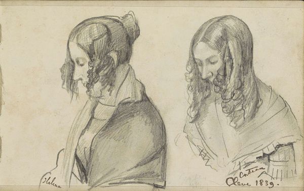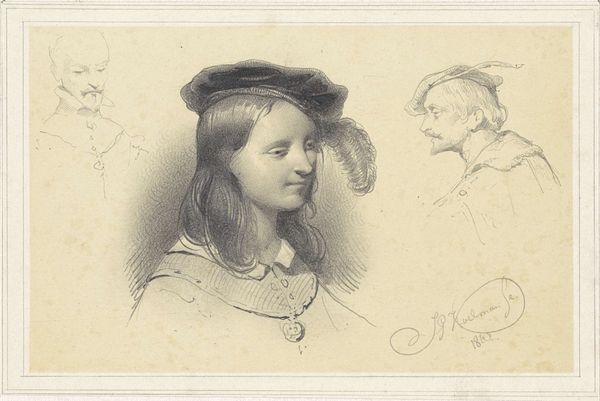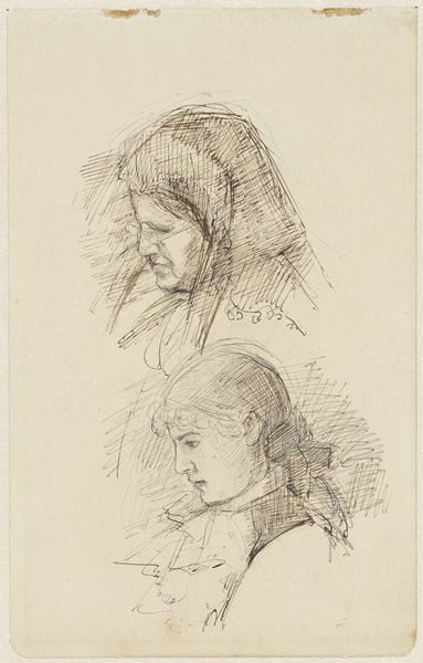 Christiaan Julius Lodewijk Portman created "Sketches of Three Women's Heads" in 1832 using pen in brown ink on paper. The composition is dominated by three studies of women's heads, each tilted slightly, with eyes closed in what appears to be quiet reflection. The simplicity of the line work and the uniformity of the brown ink, create a serene and intimate viewing experience. This is reinforced by the formal arrangement of the heads, which are close together, yet each remains isolated in their own space. Portman is not concerned with conventional portraiture, but rather explores the geometric forms underlying the human figure. The figures seem to challenge the viewer to look beyond the literal representation, prompting one to consider the essence of form, presence, and the silent dialogues between space and shape. Through this, the artwork invites continuous re-interpretation.