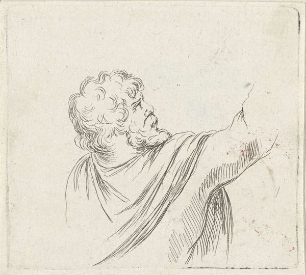 Curator: This drawing, "Head of Bearded Old Man Shown in Profile, Looking Up," is an intriguing example of draftsmanship from the 17th century, placing it within the Baroque era. Currently residing here at The Met, it uses charcoal to capture the minute details. Editor: Oh, my god, this drawing has got me feeling…old? But also serene. He looks like he’s mid-sneeze or perhaps catching the scent of something wonderful, gazing upwards as if he is anticipating beauty from the sky, you know? The color just drenches it in age! Curator: It’s interesting that you perceive that anticipation. Thinking about power dynamics in the 17th century and how they were performed through portraiture and the very male gaze, it may seem to echo sentiments on the subjugated person waiting or praying to a divine power, someone completely outside themselves, a king perhaps? Editor: Interesting point! I get the idea that those curls are incredibly expressive. Both in his hair and beard, so untamed; it reminds me of someone fighting to be heard! Perhaps this old man, whatever his place in the social order, is yearning. Craving something just beyond his reach, and maybe that ‘something’ is equality. He demands attention with all the frizz in his whiskers. Curator: That is quite possible. The Baroque was nothing if not an era defined by both religious fervor, new rational ways of thinking and immense social stratifications. We should consider this in the context of political upheavals happening across Europe at the time; people would likely be constantly in that in-between state. The unknown artist captures this state so beautifully! Editor: Beautiful and subtle indeed. What starts out as what seems to be just a profile becomes a deeply complex story of a moment and, who knows, maybe of a whole societal era. It's always exciting when a portrait has a life that keeps whispering. Curator: Agreed, looking at artworks through a critical, intersectional lens definitely opens it up for conversation.