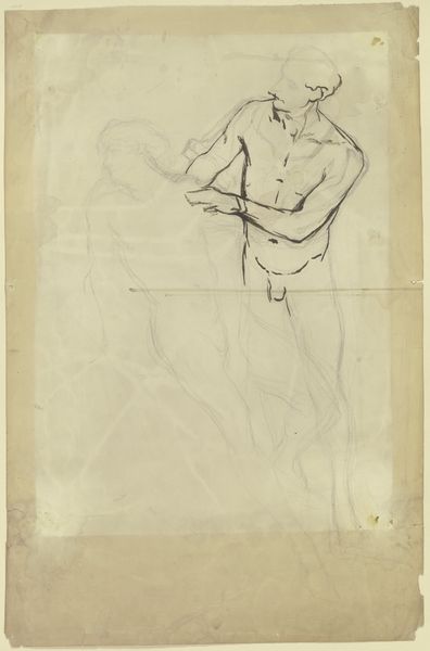 Curator: This drawing by Hans Thoma, dating back to around 1884, is titled "Zwei Winde. Entwurf zur Decke im Café Bauer, bestehend aus vier Teilen," which translates to "Two Winds. Design for the ceiling in the Café Bauer, consisting of four parts." It's a collage, utilizing watercolor, colored pencil, and chalk. Editor: My initial impression is that it feels ethereal and unfinished, like a dream barely remembered. The figures amidst the pastel clouds evoke a sense of Romantic longing and the pursuit of the unattainable. Curator: The winds as figures represent more than just meteorological phenomena; in Thoma's Romantic lens, they are the forces of nature given human form, reflecting human passions and destiny. How do you think these wind motifs interact with the cafe context for which they were originally intended? Editor: The cafe context suggests these winds might symbolize the flow of conversation, ideas, and even gossip swirling within that social space. The artist appears to understand and incorporate ancient symbolic forces of mythology with contemporary modern life. There's a psychological complexity present too, wouldn't you say? Curator: Absolutely. The male figures, caught in moments of blowing or reaching, almost portray a symbolic binary of active and passive masculine expression that society imposed at the time, an idealized and limiting expectation. It's interesting to think about how these archetypes resonate with or challenge the audience depending on identity and gender today. Editor: It does make you consider the nature of transience. This almost feels like an early exploration of the ever-changing social and emotional climate within a seemingly permanent space like a café. Are these two figures in opposition to each other? Do they signal shifting perspectives or possibilities within the community? Curator: That's an insightful interpretation. The beauty of encountering these designs now, outside their original context, lies in precisely these multilayered dialogues they spark, allowing us to engage in conversation across generations and cultural perspectives. Editor: Yes, contemplating art outside of its intended framework certainly lets us rethink the enduring human preoccupation with symbols and how these symbols constantly evolve. This has given me plenty to contemplate!
