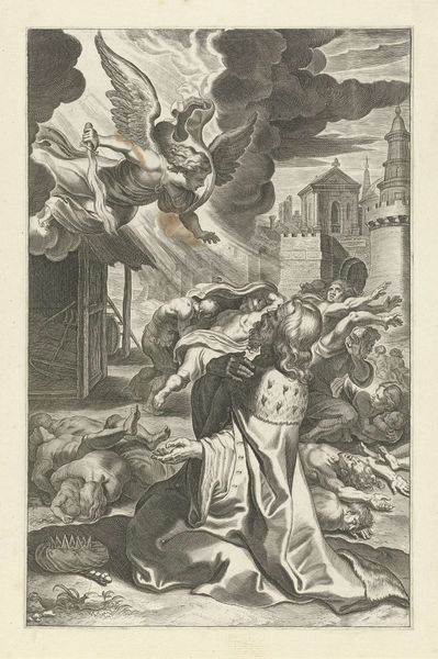 This is an engraving of King David seeing the Angel of Death, made by an anonymous artist and now held at the Rijksmuseum. The image captures a moment of divine retribution, reflecting anxieties around sin, punishment, and the role of authority. Made in the Dutch Republic, this work is indicative of a culture grappling with religious identity in the wake of the Reformation. The print would have circulated widely, disseminating ideas and reaffirming moral codes within the community. The artist uses visual cues to create meaning; the angel’s sword and the figures struck down symbolize divine wrath, while David’s pose conveys repentance. The city in the background adds a sense of contemporary relevance. To understand this print, we can examine religious texts and historical records that speak to the social function of such imagery. Art historians investigate the institutions of art to better understand such works as products of their time.