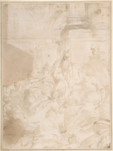 Editor: So, this is "Madonna in Wolken, verehrt vom Erzengel Michael und dem Heiligen Petrus" by Carlo Caliari, currently at the Städel Museum. It looks like it's an ink drawing on paper depicting the Virgin Mary with what I assume is baby Jesus, flanked by Saint Michael and Saint Peter. There’s something really striking about the weightiness of the figures compared to the lightness of the wash. What do you see in this piece? Curator: This drawing, for me, speaks volumes about the socio-political role of religious imagery. Consider the period; visualizing the Madonna and Saints wasn’t merely about devotional practice. How might this imagery have reinforced specific power structures, particularly regarding gender and religious authority? Editor: That’s a really interesting point. I guess I was so focused on the aesthetics I didn’t consider how Mary and these Saints are portrayed as these almost unattainable figures…almost like propaganda? Curator: Precisely. Note Saint Michael, armed, strong. And Mary, idealized as mother. How might these archetypes have shaped expectations and controlled social behavior of those who viewed it? Can you see the symbolic meanings embedded within this configuration, the power dynamics playing out through the poses, the gaze, even the composition itself? Editor: I see what you mean! Especially juxtaposed, they portray what society deemed to be 'good', but these figures might reflect more insidious concepts, too. Curator: Absolutely. By deconstructing this image, we expose how art serves not just as reflection but also as active participant in constructing reality. Editor: Wow, that totally shifts my perspective. I am going to consider art through that point of view from now on! Curator: Examining artwork with these intersectional views can truly highlight different viewpoints.
