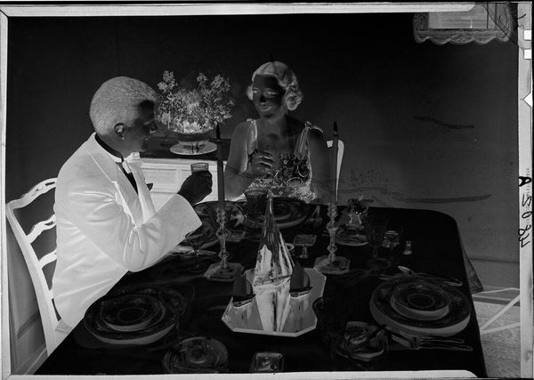 Editor: So this gelatin silver print, an *Untitled* work showing a man and woman dining at a table by Ken Whitmire Associates, presents a reversed, almost ghostly image. What strikes me is the formality, yet something feels…unsettling. How do you interpret this work? Curator: Considering the social context, it's impossible to ignore the potential commentary on race and class. The reversed image and high contrast, could that be a visual metaphor for the distorted reality and societal inversions of the time? Is it a critique of the exclusionary practices and power dynamics inherent in such formal settings? Editor: That’s a really interesting way to look at it. I hadn't considered the power dynamics. Curator: The lack of a date makes it difficult to place within a specific historical moment, but it prompts us to consider how these themes resonate across different eras. Food, after all, is often at the table with issues of identity, gender and race. Editor: I'll definitely be thinking about those societal inversions you mentioned.