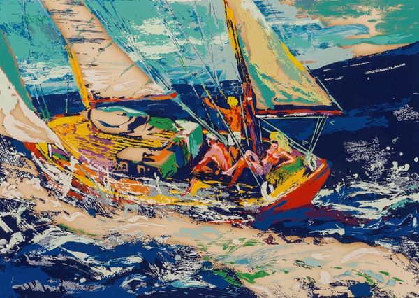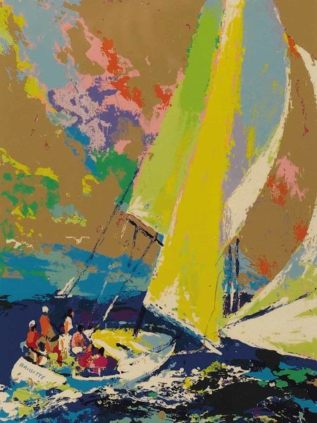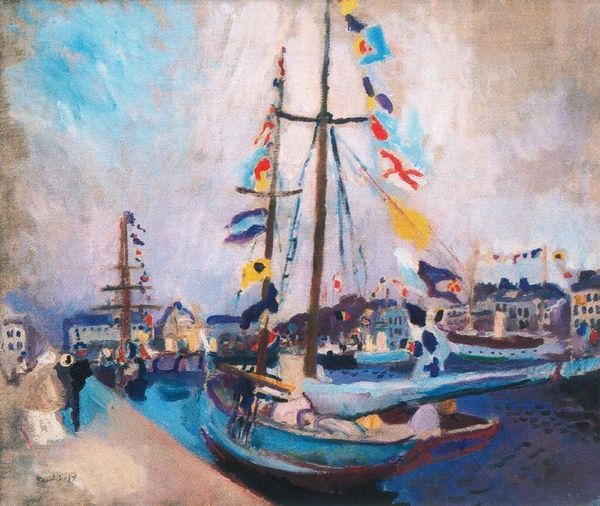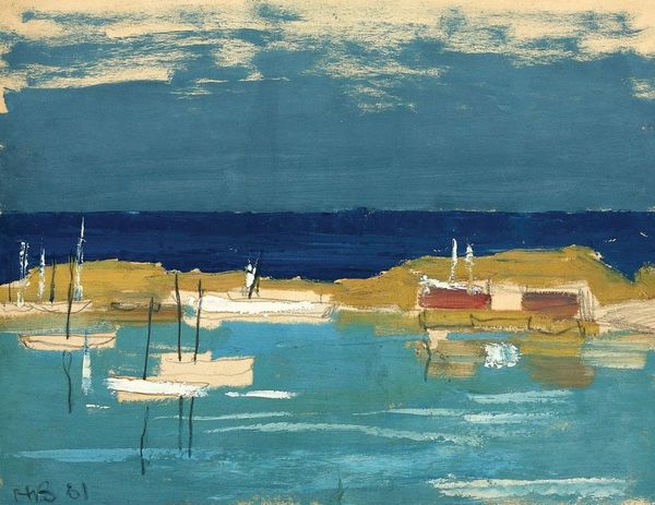 Editor: This is Ion Pacea’s "Boats at the Pontoon Dock," and it looks like it's rendered in oil paint. There's a real freedom to the brushstrokes, especially the water, which gives it a bright and breezy feel, but I can't quite decide what the overall impression is. What do you make of it? Curator: Ah, yes, Pacea. I see a joyful dance of color and texture, wouldn’t you agree? Those blues and yellows positively sing! The heavy impasto brings to mind those summer days when the sun hits the water just so, almost blinding you with its brilliance. Can you sense that feeling? It's like he captured a fleeting moment, the essence of light and water rather than a precise representation. Editor: I can see that, the light definitely vibrates. But it almost feels abstract because it is so expressive. The forms of the boats barely seem to matter, it's all about the color and movement. Curator: Precisely! Think of the Fauves. Color liberated! Form secondary! Pacea allows color to express emotion. Each brushstroke is like a breath of fresh air, a pure sensation. This almost tilts towards total abstraction, doesn’t it? What feelings surface as you allow the work to permeate? Editor: It makes me feel, maybe unexpectedly, serene. The chaos of the brushstrokes somehow resolves into a peaceful image. It also has me thinking about capturing movement in painting. I can't stop trying to visualise what these docklands would have really been like and, in turn, the feeling of painting "en plein air". Curator: Beautifully articulated! Painting "en plein air," open air, is key here, isn’t it? Like a visual haiku, capturing the ephemeral quality of nature's beauty in its truest sense. And this little trip down to the docks also taught me more about *your* seeing; something for us both to savor today.