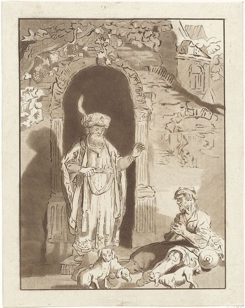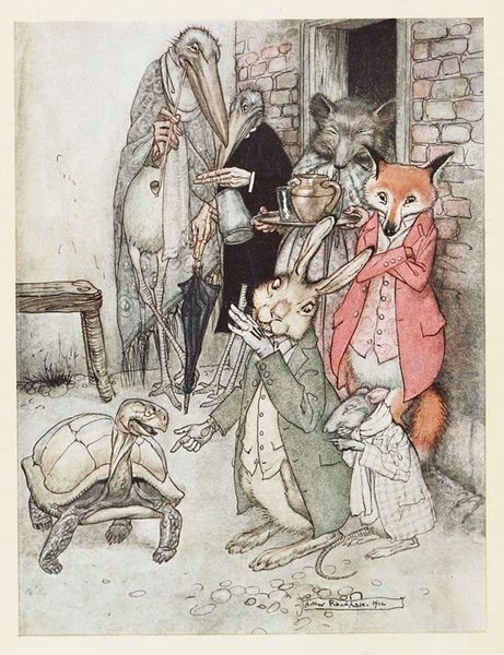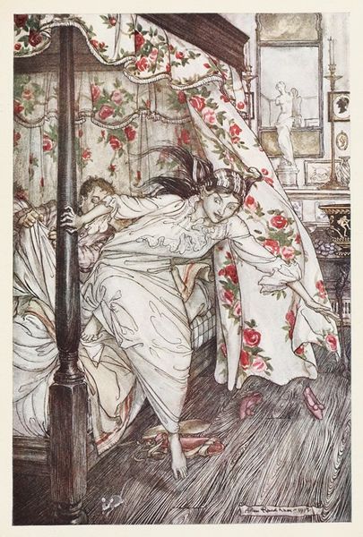Arthur Rackham made this illustration, "Taking the keys of the castle, Jack unlocked all the doors," sometime in the early 20th century, using ink and watercolor. I love the looseness of his lines and the almost muted quality of the colors. You can feel the speed and freedom of his hand at work. He creates this eerie scene using a limited palette, mostly browns and grays, punctuated by pinks and reds. If you look closely at the ogre, you can see the texture that Rackham achieves with cross-hatching. The lines are so free and yet so precise, defining the contours of his grotesque face. His use of layering and transparency in the watercolor gives the scene a ghostly, ethereal quality. The ogre's exaggerated features, the flowing lines of the women's dresses, and Jack’s movement all combine to create this sense of unease. It reminds me of Paula Rego, who also uses fairytale imagery to explore darker, more complex emotions. Ultimately, the power of Rackham's work lies in its ability to evoke a sense of magic and dread.