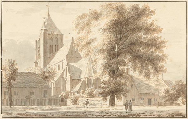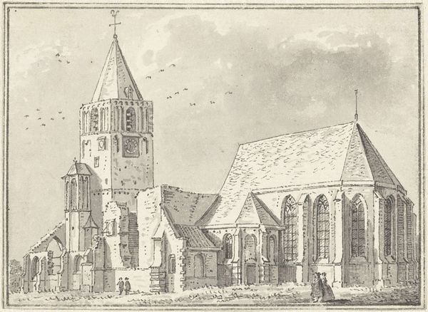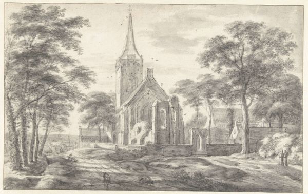 Editor: This drawing, "Kerk van West-Souburg" by Cornelis Pronk, was made in 1746 using pen and ink. It has a really calming feel, despite depicting a rather old, crumbling church. I’m intrigued by the contrast between the detailed architecture and the looser rendering of the surrounding landscape. What do you see in this piece from a formalist perspective? Curator: The power of this drawing, for me, lies precisely in that tension you mentioned. Pronk masterfully juxtaposes linear precision, evident in the architectural rendering, with a more suggestive treatment of the natural elements. Note the stippling technique used for the foliage, compared to the crisp lines defining the church’s structure. Editor: Yes, that contrast really does bring out the details. How does the composition contribute to the artwork's overall effect? Curator: Observe how the artist positions the church slightly off-center, creating a dynamic asymmetry. The architectural mass anchors the composition, while the open space to the right and the staffage – those small figures and animals – introduce a sense of movement and spatial depth. Furthermore, the receding planes are skillfully articulated through subtle variations in line weight and density. Do you perceive how this intentional imbalance enhances visual interest, preventing the work from becoming static or predictable? Editor: Absolutely, the off-center placement prevents it from feeling too rigid. It's fascinating how much the technique itself impacts how we experience the scene. The lines give structure while also evoking a sense of delicate transience, a capture of this space in a moment. Curator: Precisely. The seemingly simple act of drawing, when executed with such technical command, transforms the ordinary into something profound. We appreciate not just *what* is depicted but *how* it is depicted. Editor: I'm glad you pointed out the subtleties in Pronk’s technique. Now I see how the composition enhances my reading of decay and persistence. Curator: Indeed. This approach allows for new possibilities for interpreting architecture and the art itself.