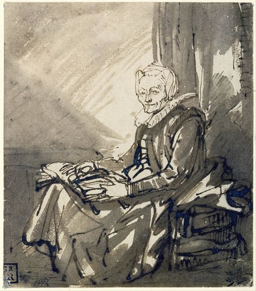 Editor: This is "La Vieille" by William Lee-Hankey, rendered as an etching. The old woman looks so forlorn. There's such intricate line work; it's really remarkable! What stands out to you? Curator: Immediately, I'm struck by the composition. The artist has masterfully used hatching and cross-hatching to build form and texture, thereby creating a strong contrast between light and shadow. Note how the density of lines increases in areas meant to recede, enhancing the figure's volume. Editor: The hands especially seem so detailed and really tell the story of a life lived. What can we tell from that line? Curator: Observe the formal relationships at play. The lines that delineate her dress and the background suggest confinement, contrasting her stooped posture with the sharp angularity. In doing so, her stillness speaks not of calm but perhaps, quiet endurance. Editor: I see. So the lines are almost a character themselves, contributing to the feeling of melancholy! Do you notice anything else special about it? Curator: Notice too, how Lee-Hankey utilized the intrinsic nature of the medium itself. Each line appears distinct, bearing witness to its individual genesis as it was etched onto the plate. Such precise application transforms emotional content into visual data. Editor: It is incredible how technique itself becomes part of the emotion. So, it isn't just WHAT is represented but HOW. I definitely learned a lot looking at the etching with you. Thanks. Curator: And I in observing it freshly through your eyes!