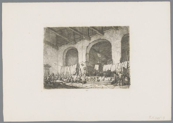 Curator: "Kinderen krijgen catechese in de kerk," or "Children Receiving Catechism in Church," is the title of this drawing rendered in ink on paper. Johannes Bosboom completed this piece sometime between 1827 and 1891. It's currently housed here at the Rijksmuseum. What's your initial take on this genre scene? Editor: The high contrast of light and shadow creates a solemn atmosphere. The composition, with the strong verticals of the architecture, lends the work a sense of austere grandeur. Curator: I'm interested in how Bosboom is presenting religious instruction within the socio-political context of the Netherlands in the 19th century. How were ideas of religious authority and social order being imparted to the young through education, especially when viewed through the lens of colonial history? What were the pedagogical implications inherent to faith, indoctrination, or lack thereof? Editor: An interesting interpretation. Structurally, I notice the drawing is bisected into defined zones. There’s the architectural space that creates the backdrop, and the distinct gathering of figures assembled within. It creates a clear separation between the divine and the mortal, if you will. Curator: But notice how Bosboom uses the teacher's position to reinforce a paternalistic structure, which serves to mirror Dutch society itself. I would contend that the image subtly promotes cultural biases, while projecting this assumed unity and shared values that were used to normalize control. Editor: Certainly a plausible interpretation. Zooming in though, I am fascinated with the masterful use of ink. The crosshatching and line work creates a tangible texture, and models the soft gradations of light. These choices amplify a tangible sense of depth and space within a relatively monochrome palette. Curator: It is essential to see the figures not just as aesthetic elements but as part of a larger narrative of religious education and its relationship to power, gender, and societal change. What impact does mandatory religious schooling have on future civic and political participation? Bosboom offers just a narrow snapshot. Editor: I concede, I find your focus very valid. Ultimately, it does make me re-assess the inherent dynamics at play, even beyond the formal qualities. Curator: Exactly. I hope we have offered listeners multiple points to consider!