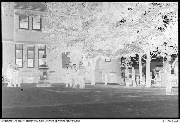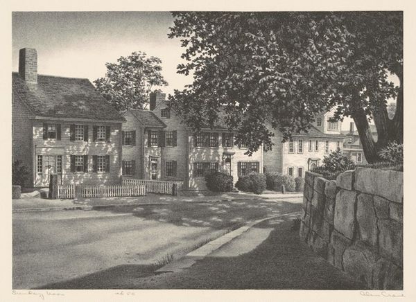 Curator: This photograph, by Martin Schweig, is simply titled "Untitled (party guests standing around patio of large house with servers standing by bar)." Editor: It has such a ghostly feel, doesn’t it? All those figures fading into a dark lawn before this massive house. Curator: Indeed. The composition is striking, with the house acting as a strong vertical anchor, contrasting with the horizontal lines of the patio and the implied movement of the guests. Note how Schweig plays with light and shadow, creating a sense of depth. Editor: I’m drawn to the labor involved. The servers at the bar, the meticulously manicured lawn – all signs of significant work and resources poured into this event. The making of this image, too, the photographic process itself, is labor intensive. Curator: Yes, and the contrast of textures, from the rough brick of the house to the smooth attire of the guests, contributes to an overall visual tension. Editor: It makes you wonder about the unseen workforce that enables such gatherings. The photographic materials used to document it, the social structures that perpetuate it. Curator: It seems we’re each seeing very different dimensions in this single frame. Editor: That’s the beauty of it, isn’t it? Finding our own meanings layered within.